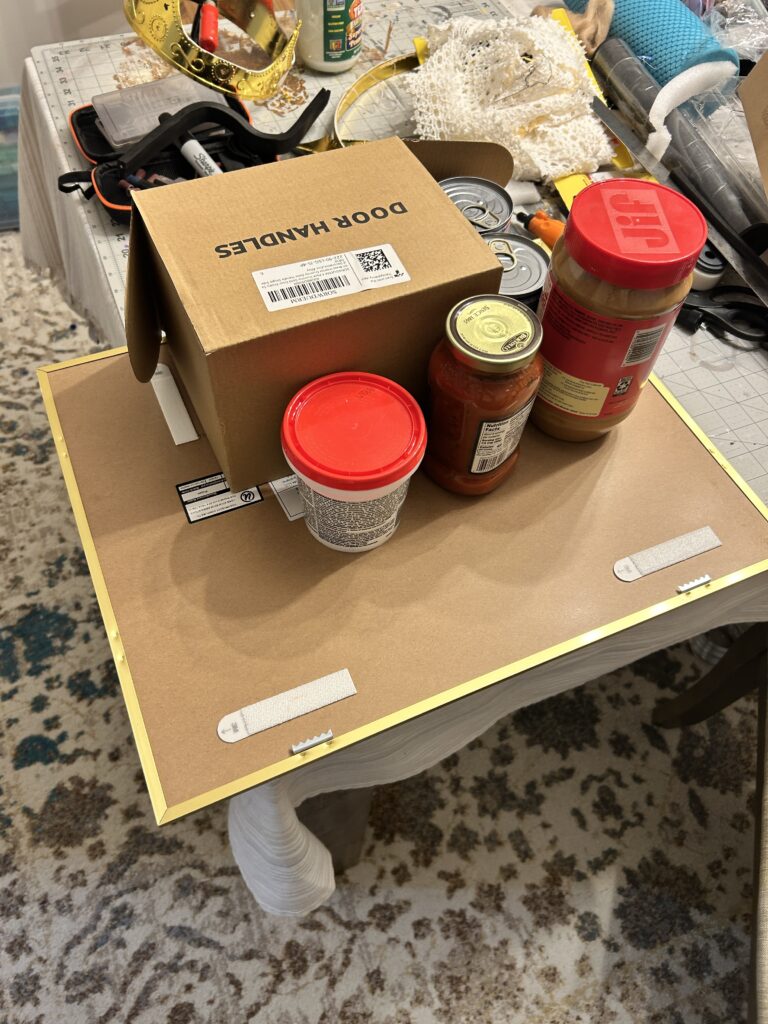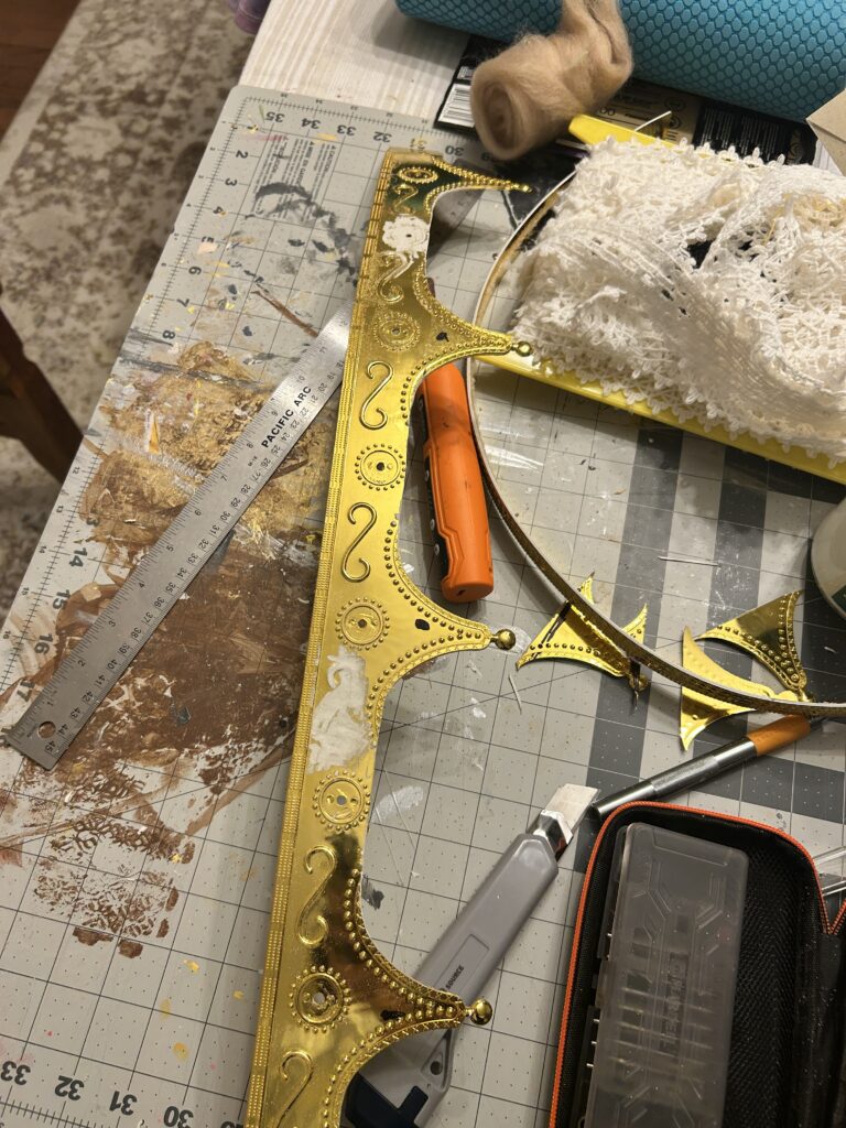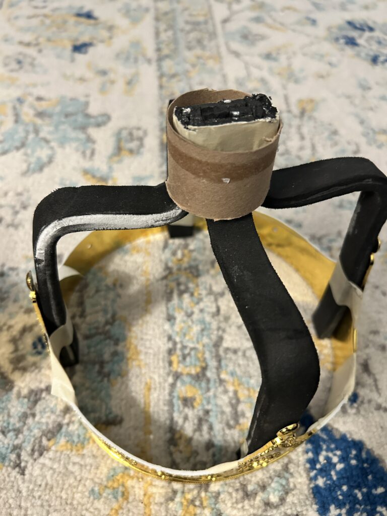 I began by cutting the base of the crown off since I did not want to use or have to disguise the texture that came on the base crown. My next step was to use EVA foam and wire to create the arches. I first cut down two pieces of foam to 2/3″ and super glued the wire in between the foam. I made all four straight and left them under weighted items over night. I then found the center of the crown and created a quick middle support beam to act as a guide to shaping my arches. I shaped one to my liking and used it as a template to shape the others. I had them all meet in the middle and secured them with glue and tape. The bottoms portions were secured with hot glue.