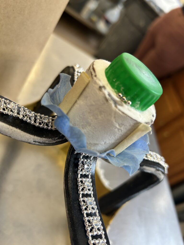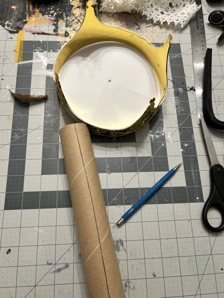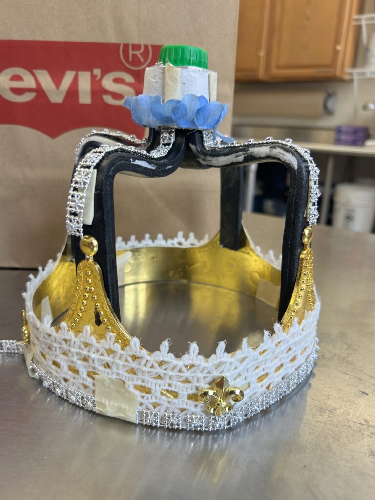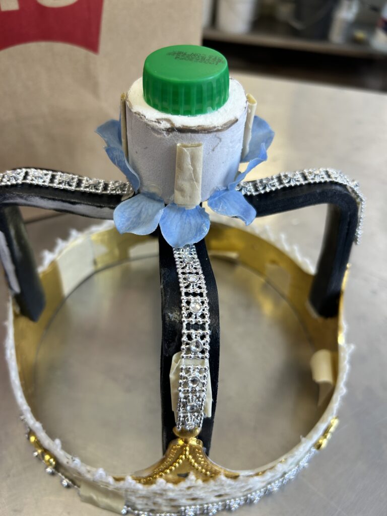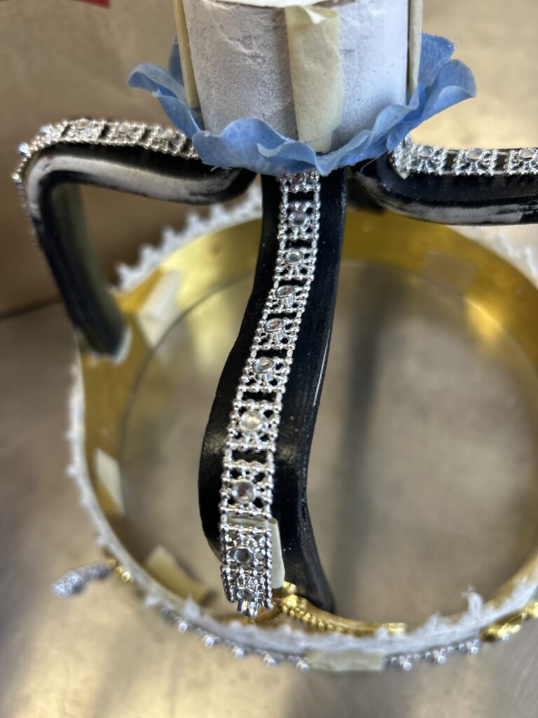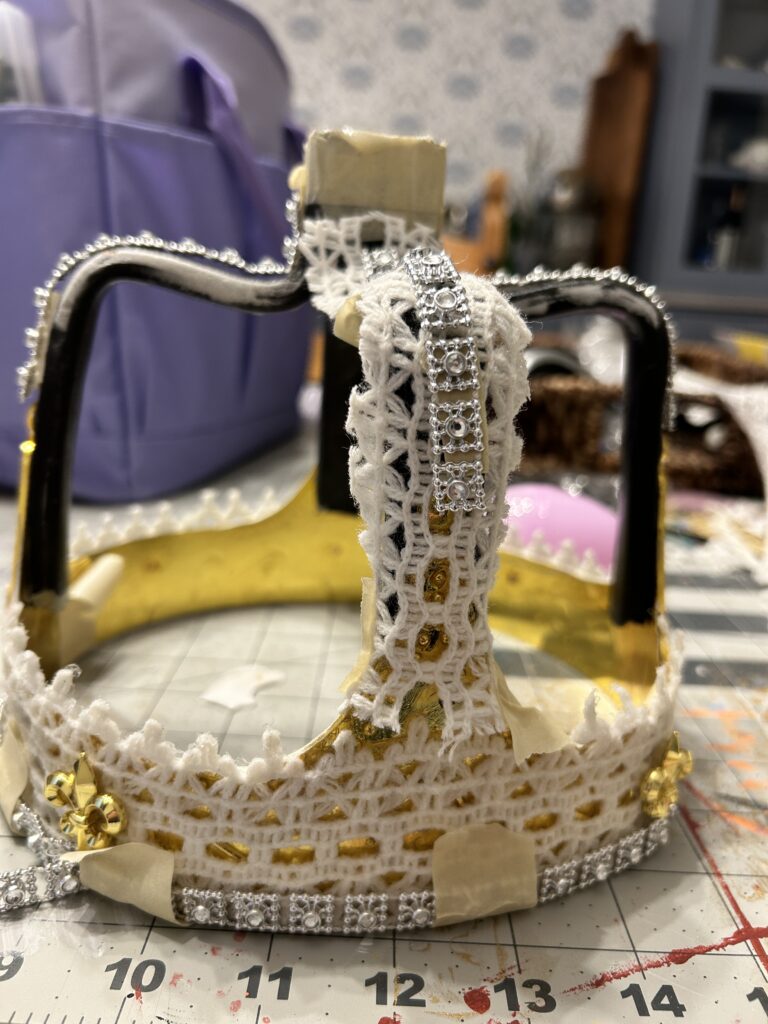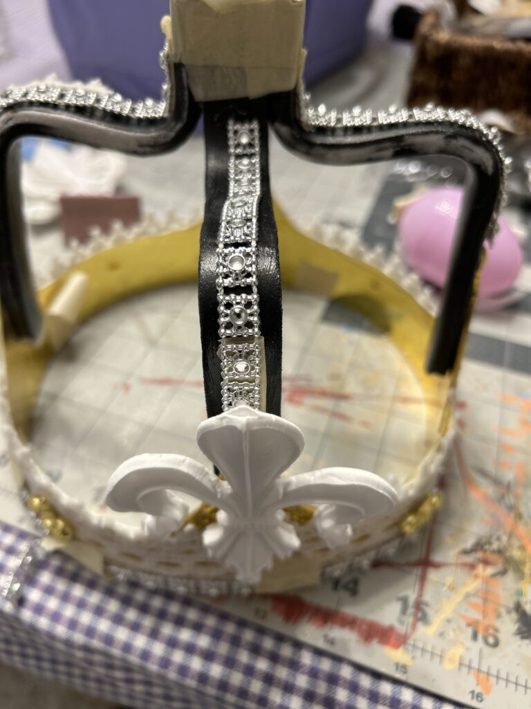 I used a crocheted lace around the perimeter of the crown to add dimension to the metal. I then used the silver trim to finish the bottom of the crown. I wanted to keep the same texture and detail drawing your eyes up the crown so I added the silver trim to the arches. After the suggestion from the professor, I added some of the crochet trim to the arches as well. I had to play around with width of the trim and decided (eventually) to not have it wrap all the way to the underside of the arch. I added more of the crochet trim to the top piece to mimic the small pieces sticking above the rim of the bottom section of the crown.
