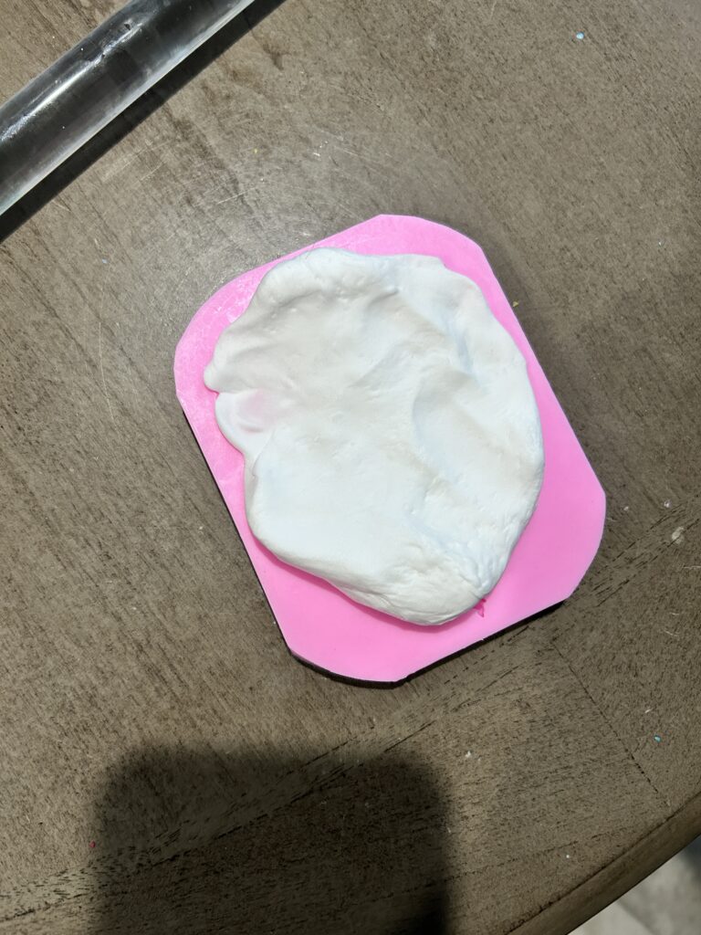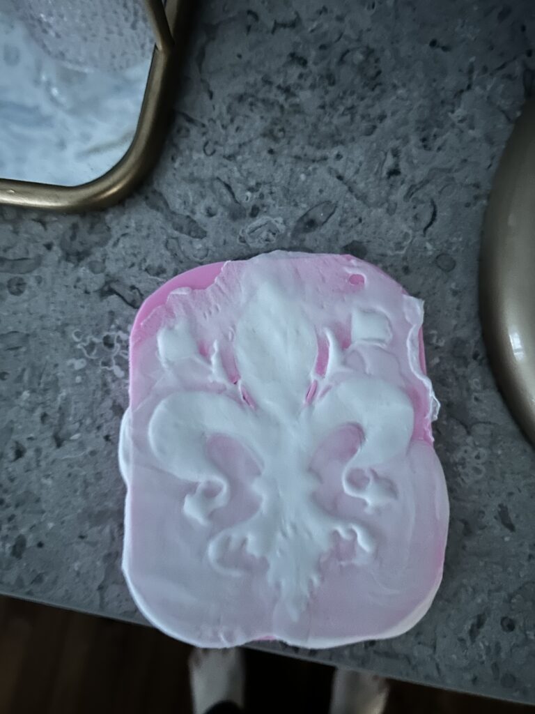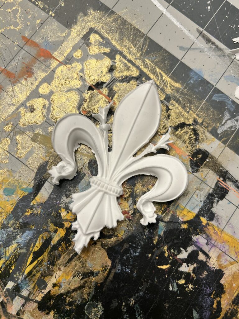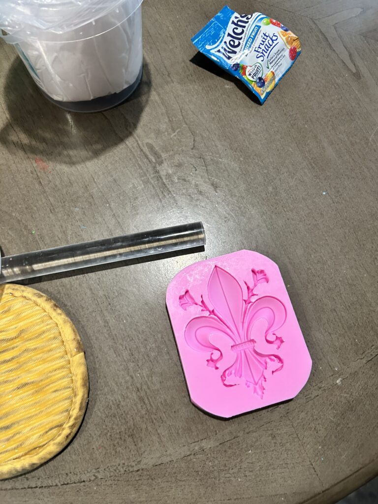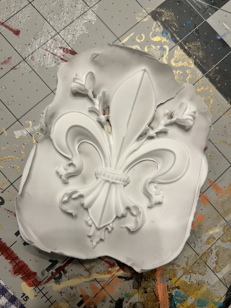 I next began to create the fleur de lis as I knew the foam clay would take time to dry out and cure. I found a silicone mold and after a few failed attempts, found that taking the majority of extra off the back led to the mold drying faster and allowing it to be released sooner. I then cut the edges out carefully with an exacto knife.