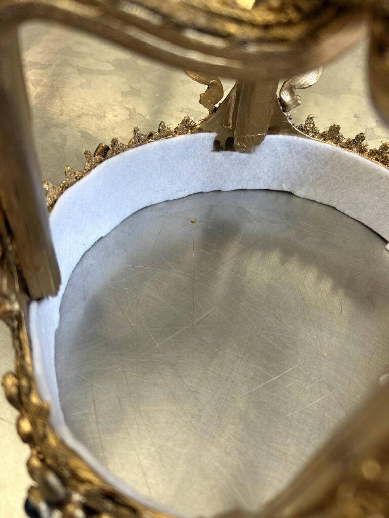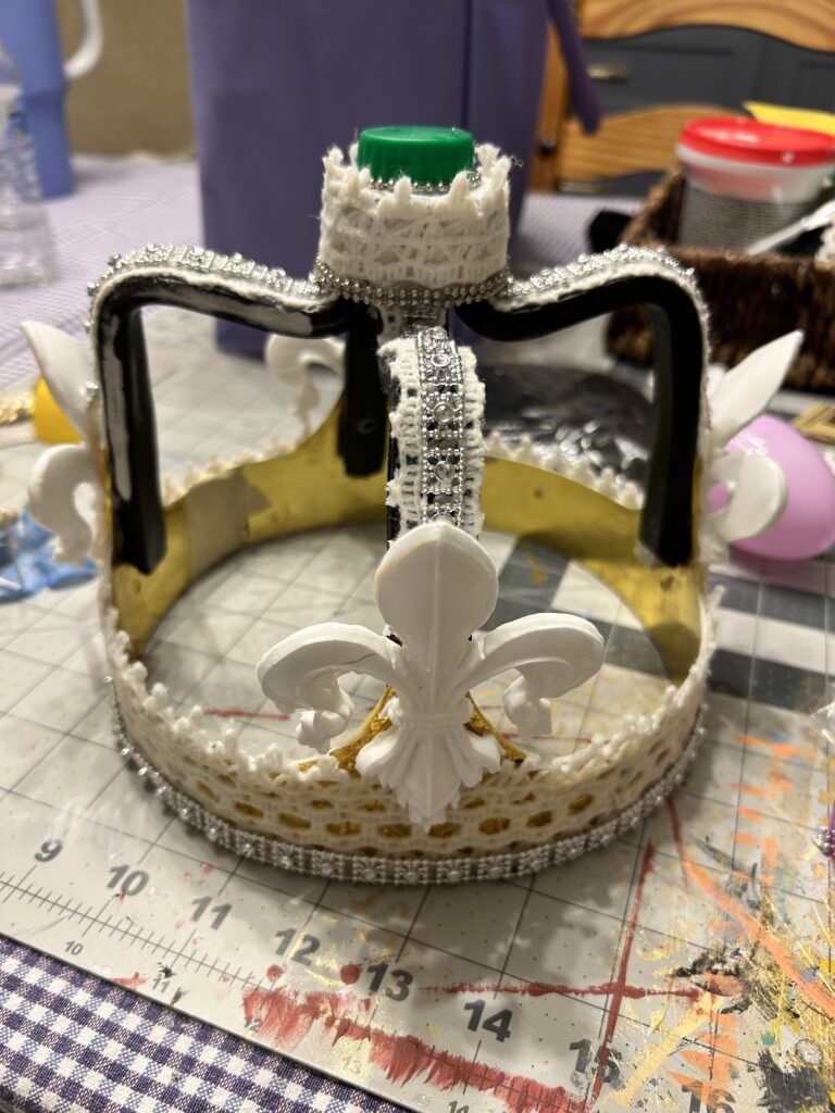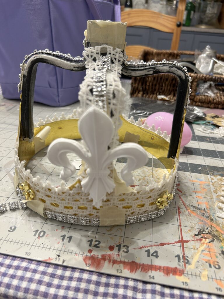 To finish the crown, I gave it a coat of Crystal Gel to give it some more shine. I lined the inside of the crown with felt for comfort for the actor. Finally, I added the top crystal and added the blue stones to the smaller fleur de lis on the band of the crown.