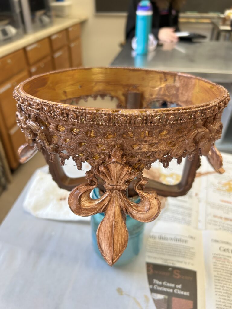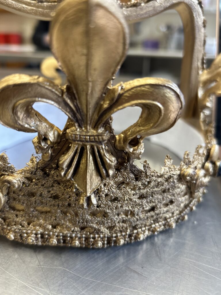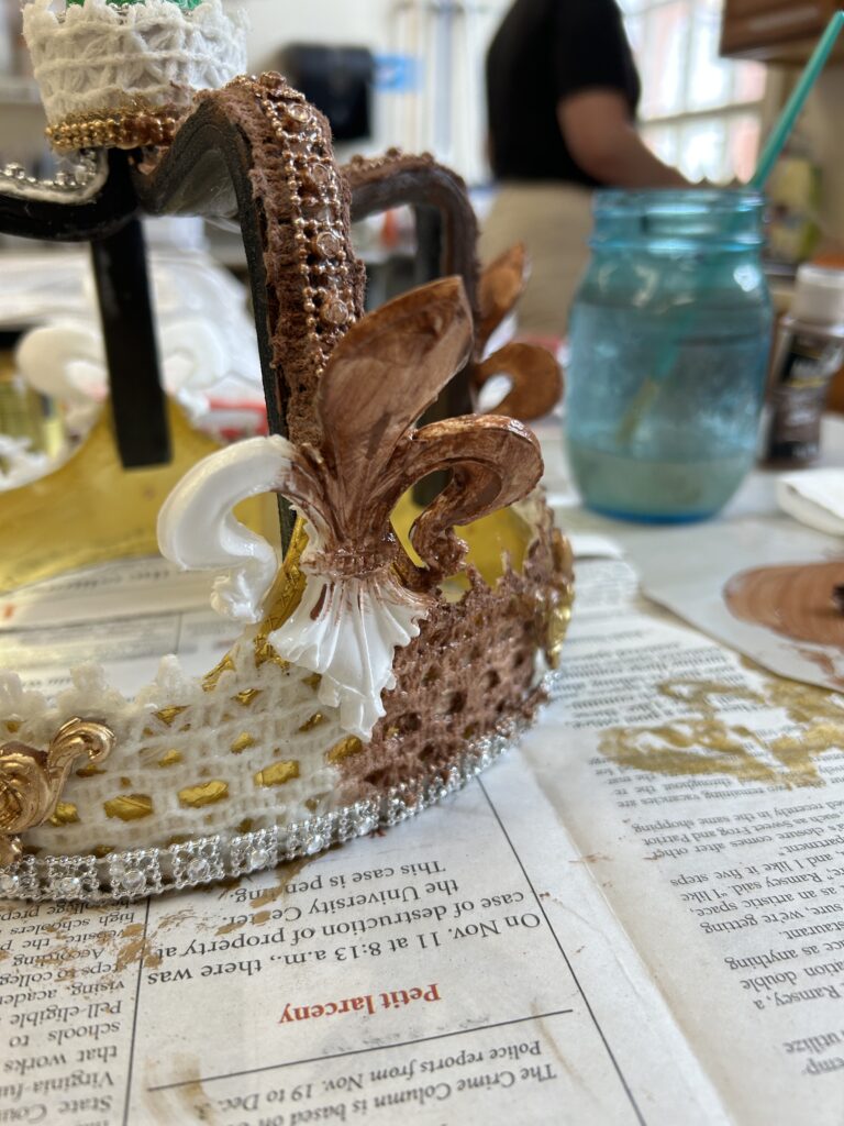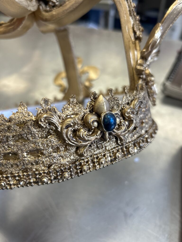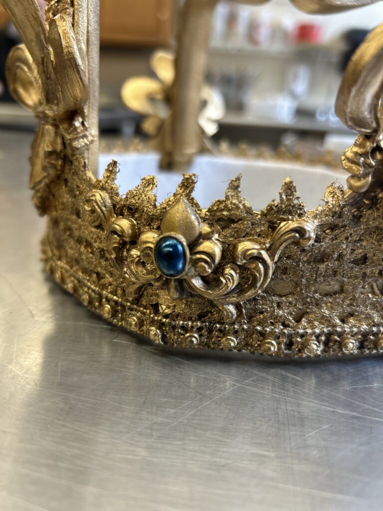 I started with a base layer of a satin brown acrylic paint. I wanted to coat the crown with a darker color that would create shadows under the gold if I missed saturating a part of the crown. I then used an alcohol based liquid gold leaf paint. I did two coats of the gold. I then went in with a dark bronze color of rub and buff to add shadows in the crevices of the textured pieces.