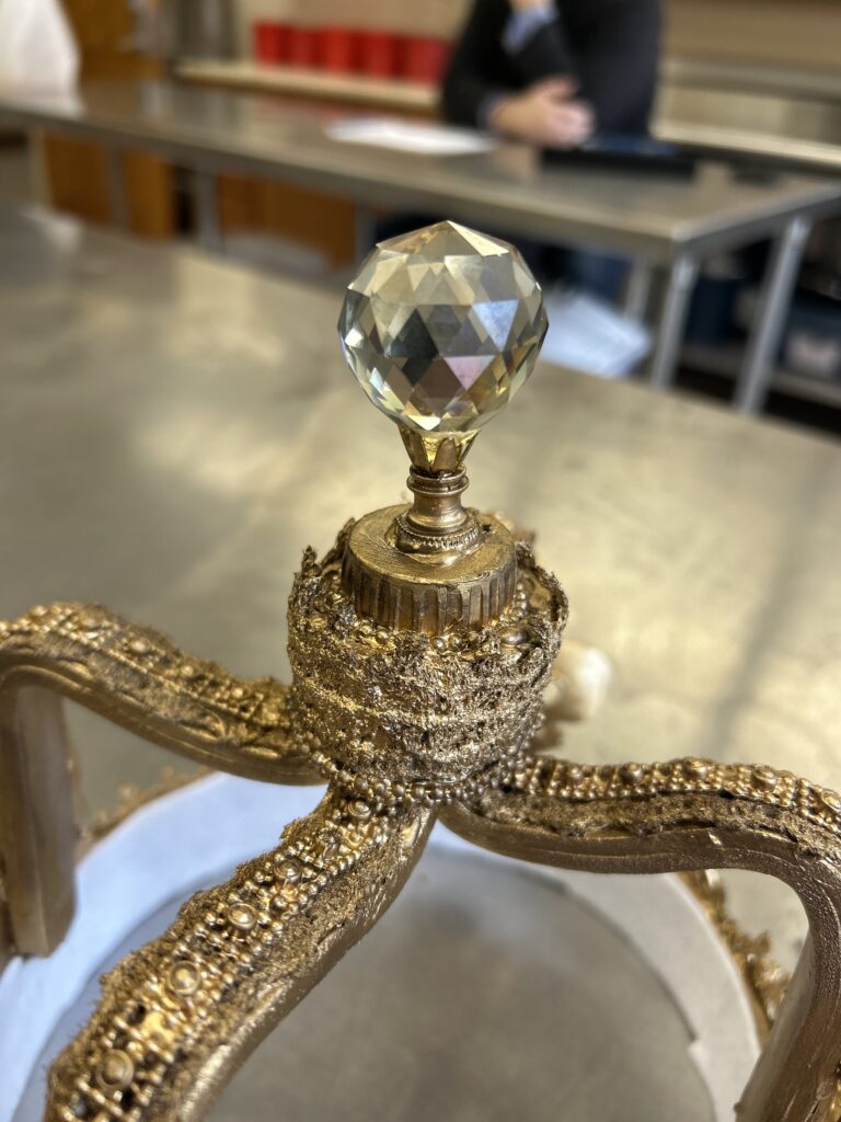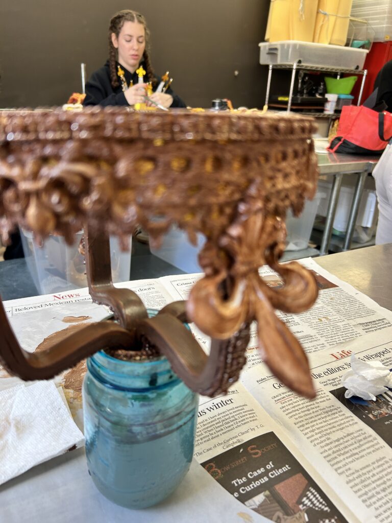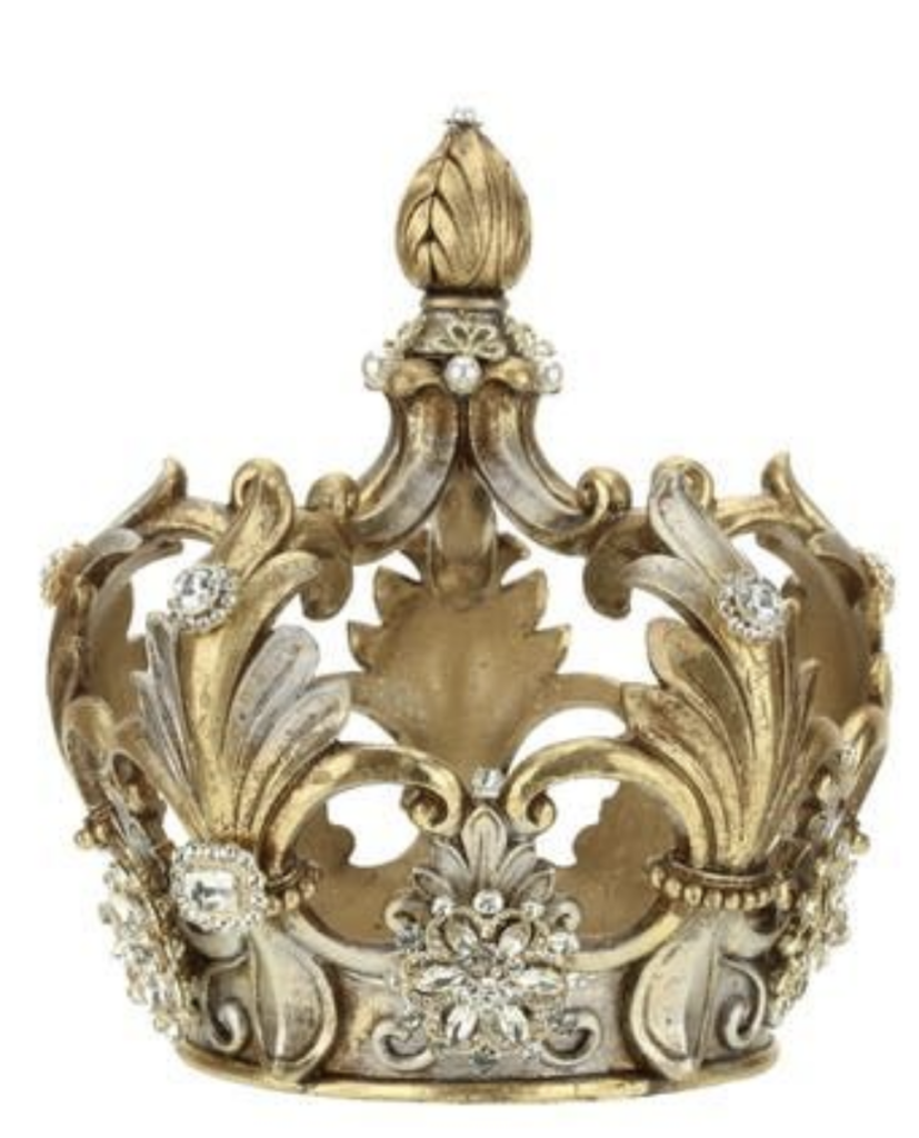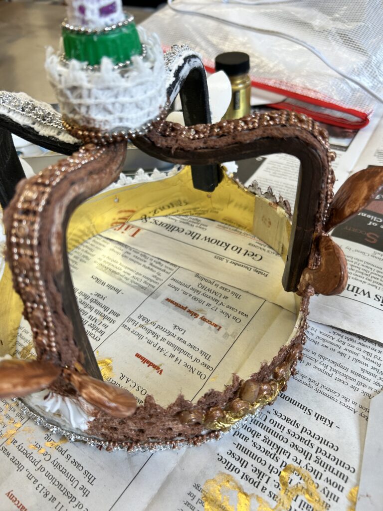 I started with a base layer of a satin brown acrylic paint. I wanted to coat the crown with a darker color that would create shadows under the gold if I missed saturating a part of the crown. I then used an alcohol based liquid gold leaf paint. I did two coats of the gold. I then went in with a dark bronze color of rub and buff to add shadows in the crevices of the textured pieces.