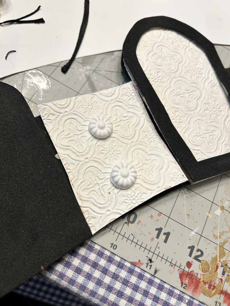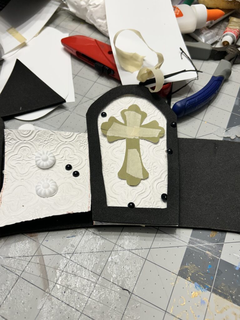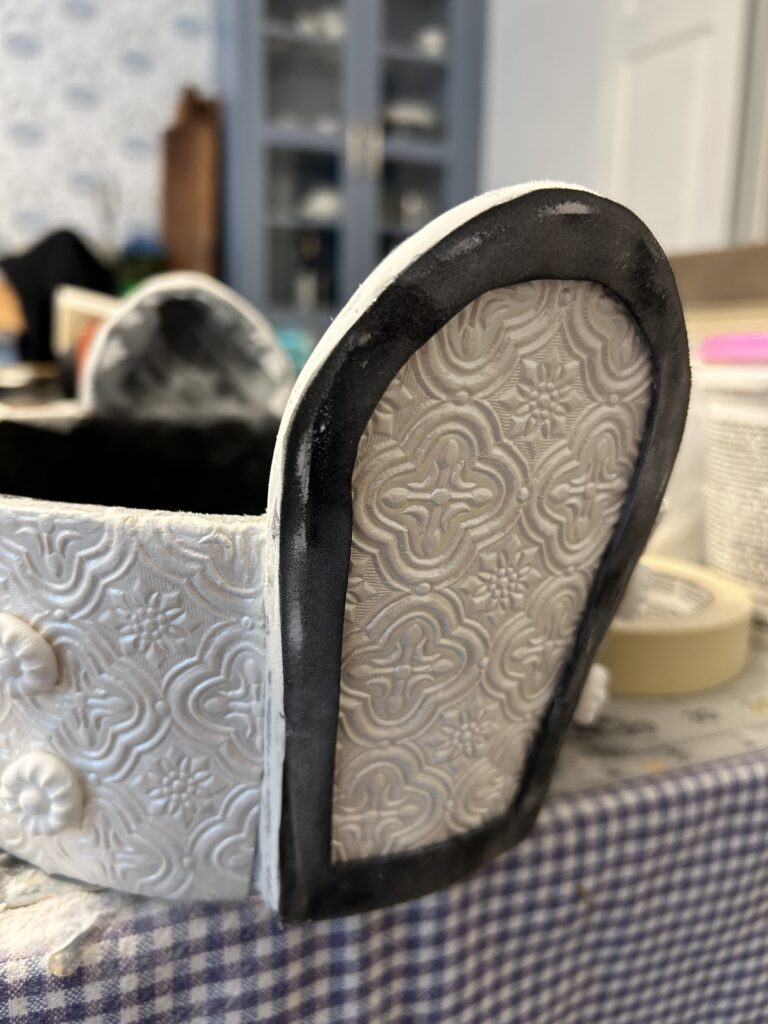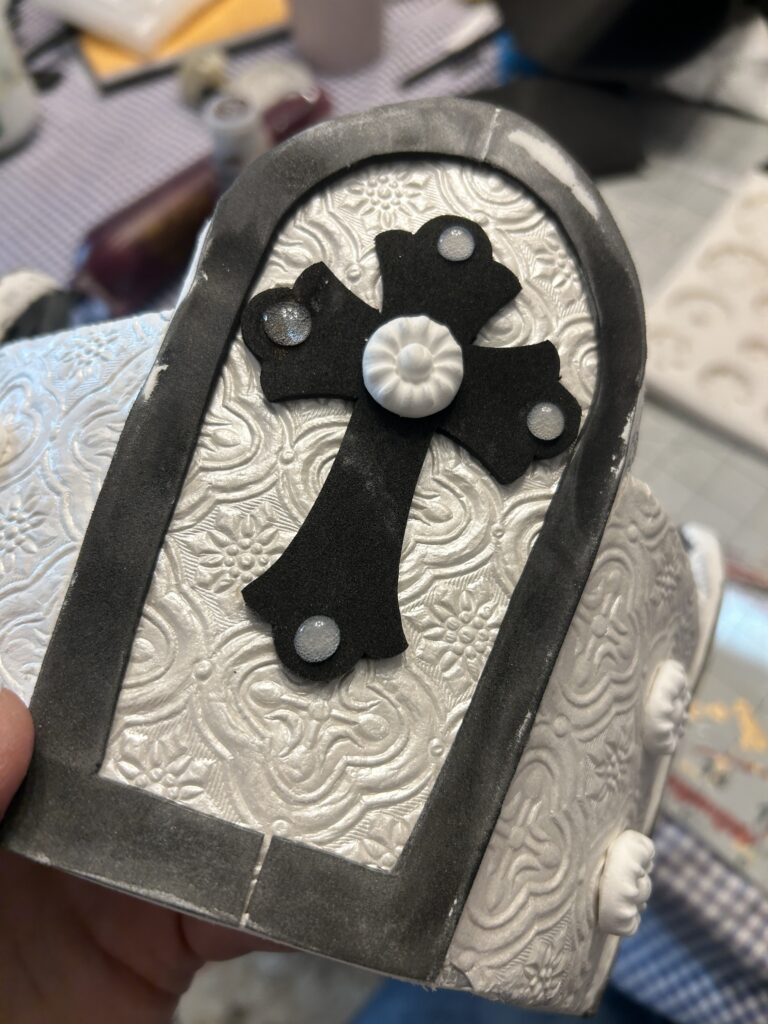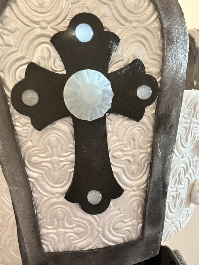 I found this lovely embossed paper that felt perfect for the texture of the crown. I added to the inside of the spires and the outer band of the crown. I also added some circular foam clay pieces that I cast with a silicone mold left over from a previous project. The spire edges were built up with 2mm foam. The crosses were cut out of 2mm foam, with the same circular foam clay pieces added. Finally, I added a small half round details with hot glue. I wanted the spires to feel more like a solid pieces and I did not like the seams between the different layers. So I decided to use some lightweight joint compound to make it more seamless. Once this dried, I gave all the edges a light sanding. Finally, I covered the inside of the crown with 1mm foam for comfort and a cleaner look to the inside of the crown.