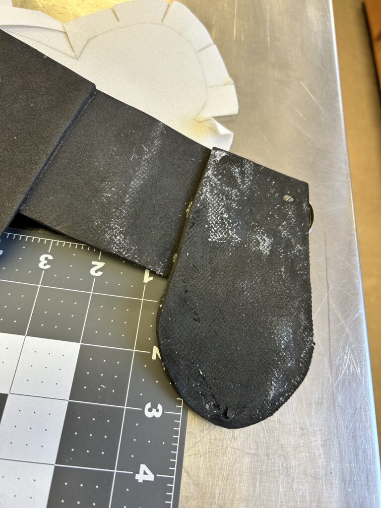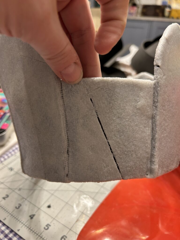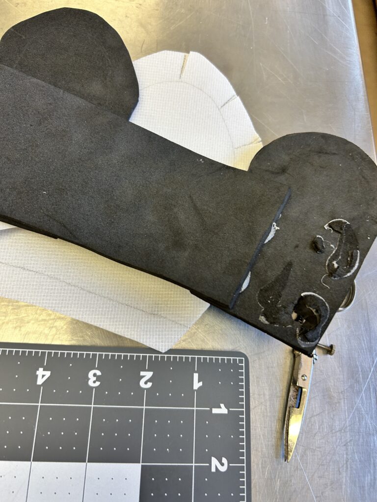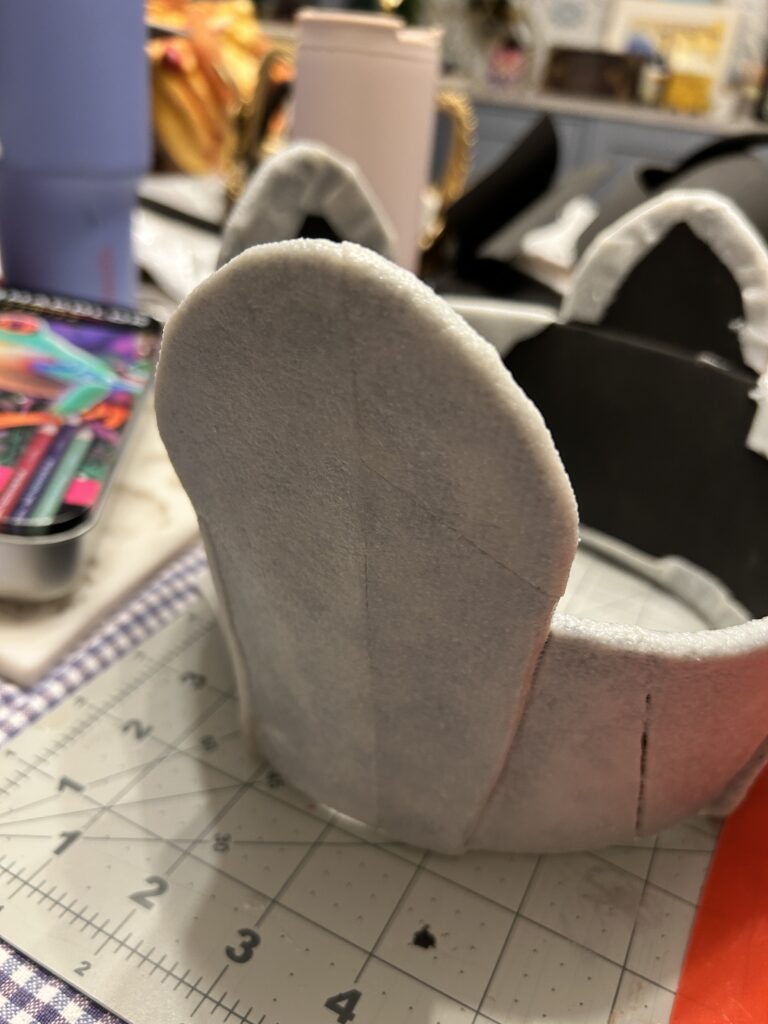 I cut relief cuts into the edges of the Wonderflex to get it to fold along the curve. My plan was to cover the back of the crown with a thin foam, so I was not worried about lining up the folded pieces. I was more worried about bumps and ridges being uncomfortable to the actors so I spent my time ensuring that there were no thick pieces.