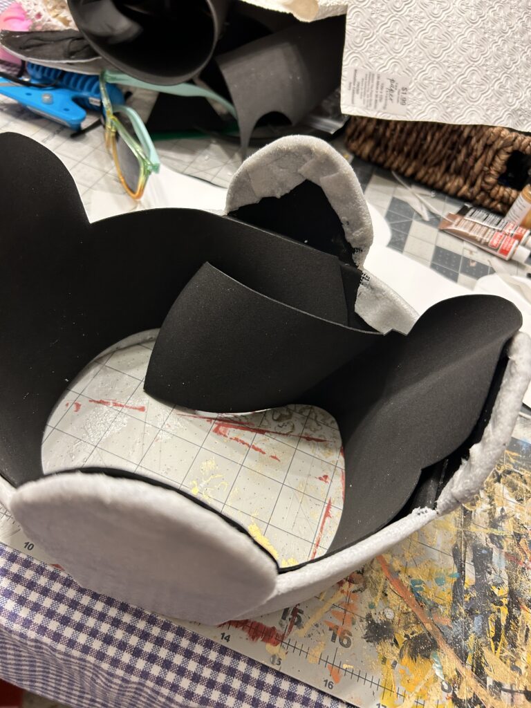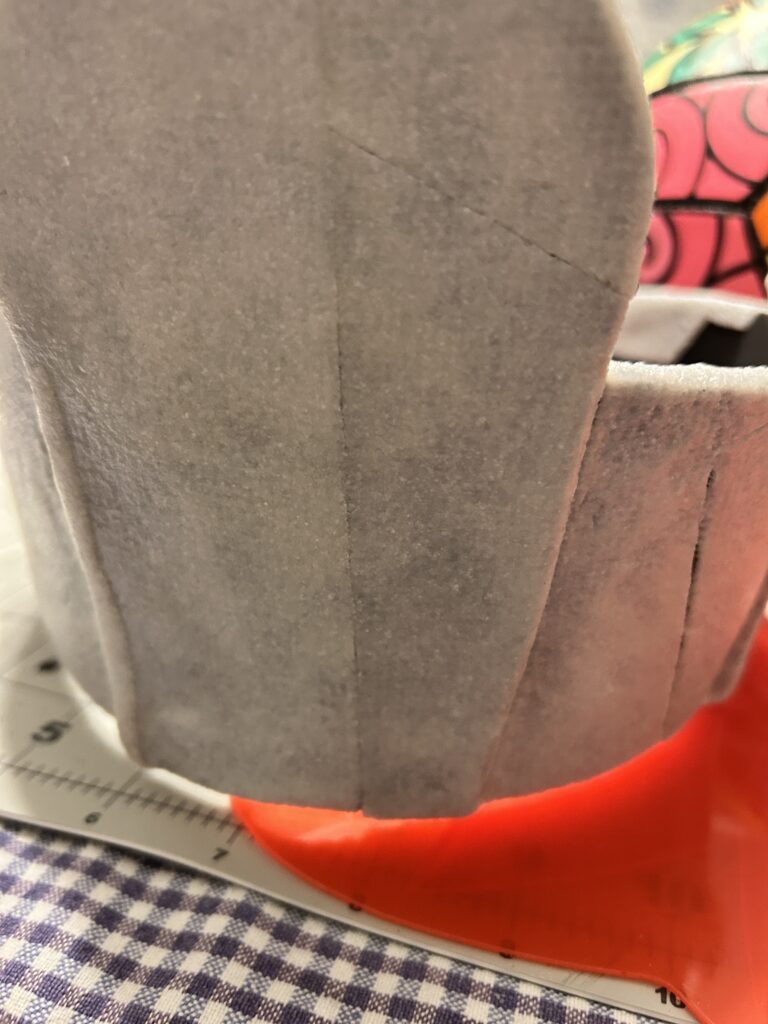 After cutting my pattern out of foam, I began covering it with the Wonderflex. I decided to attach the spires and cover the crown in one piece as I wanted the dimension of the spire sides, but I did not want to see the crack between the spire and the band.