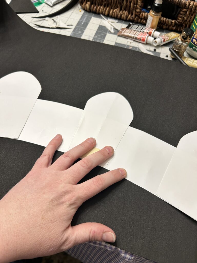 After looking in detail at the drawing, I determined a starting point for the band. I measured the circumference of my head at 22″. I added two inches for an overlay and for room to adjust the head. I decided to make the band approximately 1/3 of my face dimensions. This landed at 3 1/2″. I cut a rectangle to fit those measurement and sectioned it off in equal intervals. I cut the rectangle to spread the pattern to get the curved shape of the top of the crown band. I did 1″ in between the top of each section. Next, I shaped the spires with an oval for the top. I made the spires 2/3 taller, so they ended up at 5 1/2″. Finally, I made the base of the spires at 3 1/2″ as I wanted them to hit centered between my pupils.