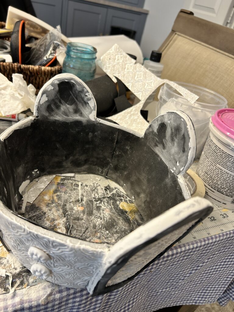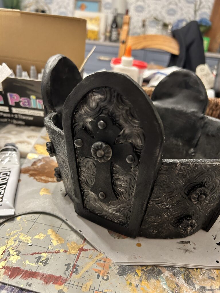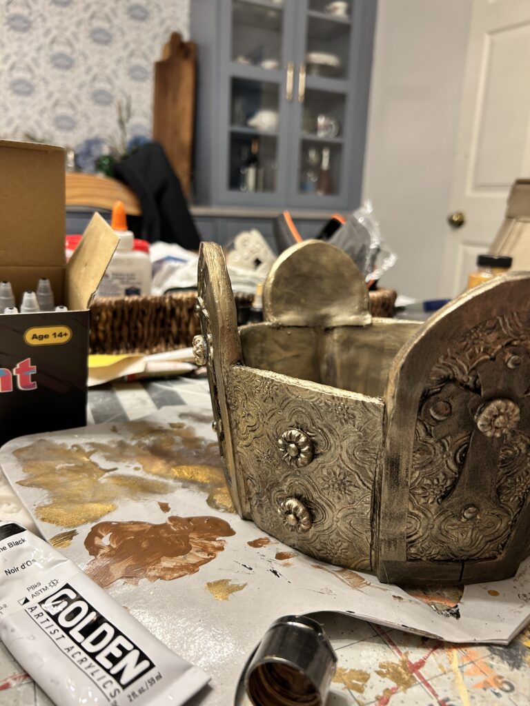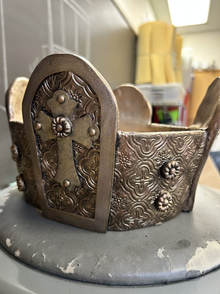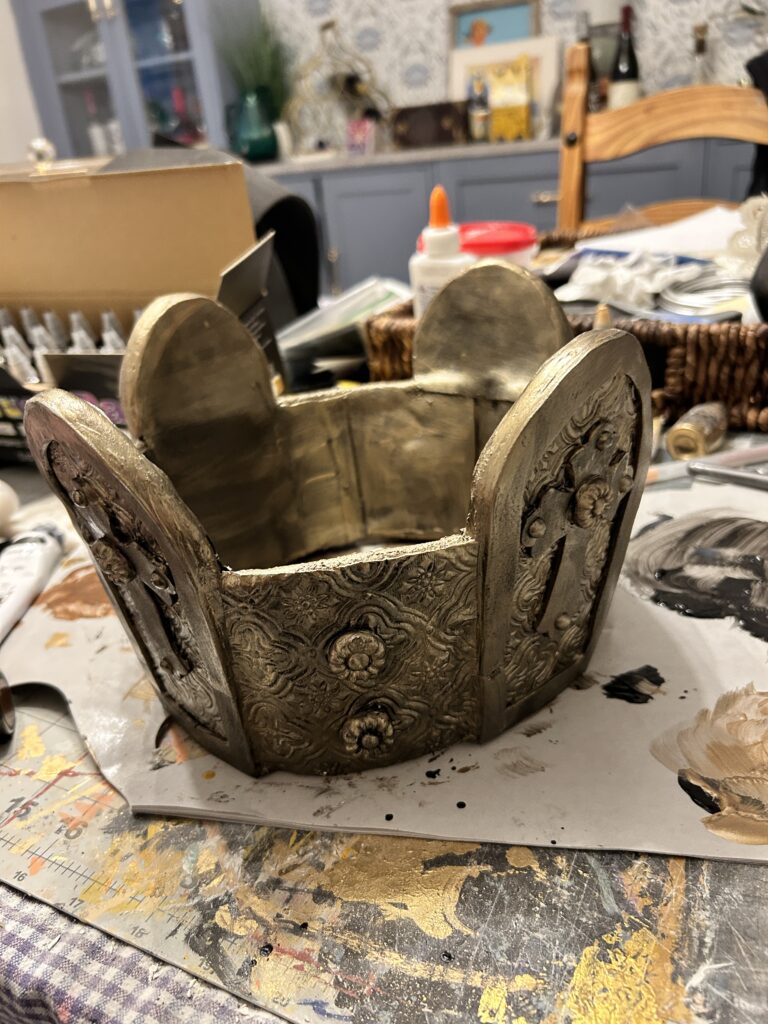 I started with a base layer of black to fill in all of the creases and textures. I then added three layers of a deep bronze metallic acrylic with some burnt sienna mixed in. Finally, I went in with a sponge and Grecian Gold Rub and Buff to give it highlights to the raised portions of the crown. I finished the crown with a light coat of sealant.