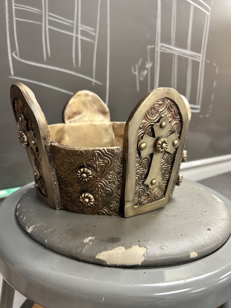 For this project, I was given a sketch by the designer. The notes stated that the crown was for the play “King Lear”. It appeared a darker gold color than I made my previous crown. It showed dimensional aspects on the side views. The notes also mentioned that the crown should be heavily textured.