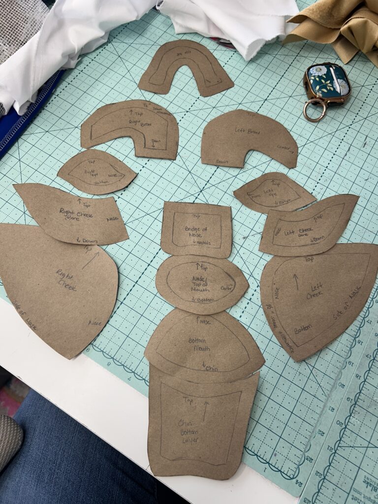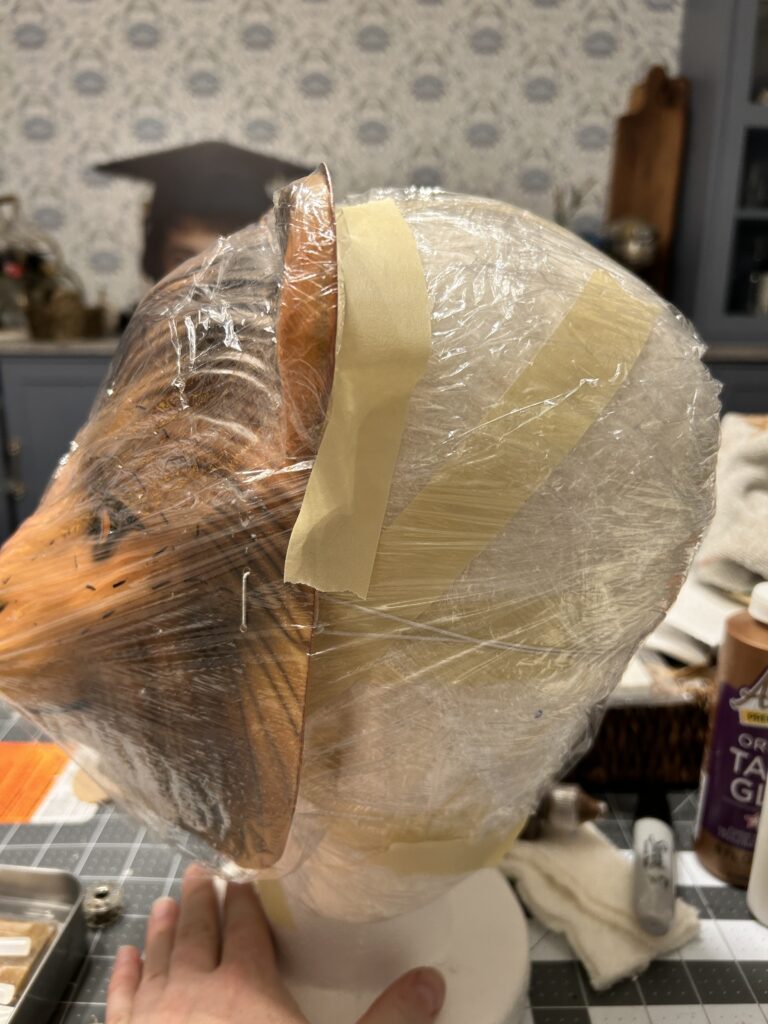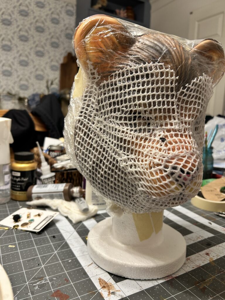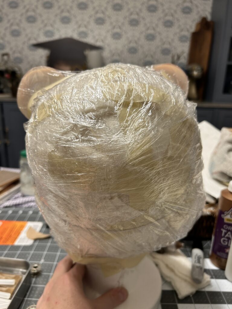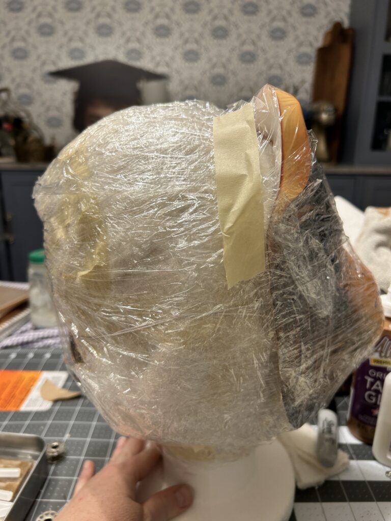 I began by taking head measurements of myself as the requirement was for the mask to fit my head. I padded the mannequin head up with quilt batting and covered it with cling wrap to protect the mask from the varaform. I then cut the varaform and softened it in hot water to start laying the shapes into the face. I used smaller pieces and really focused on keeping the dimensions of the face within the varaform.