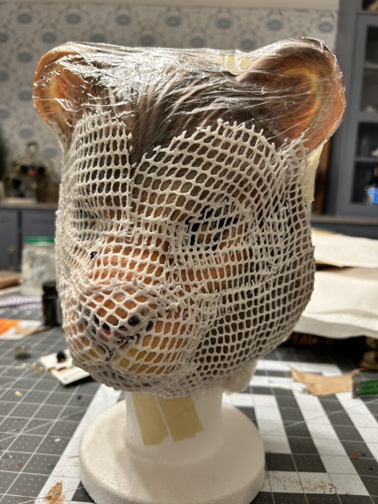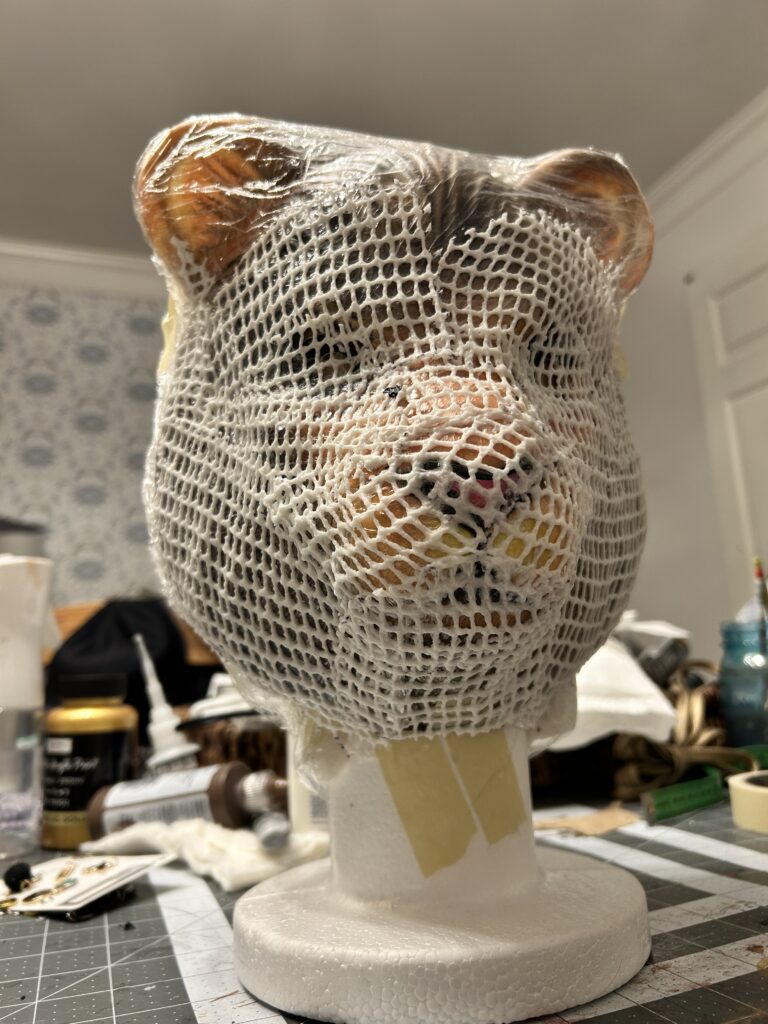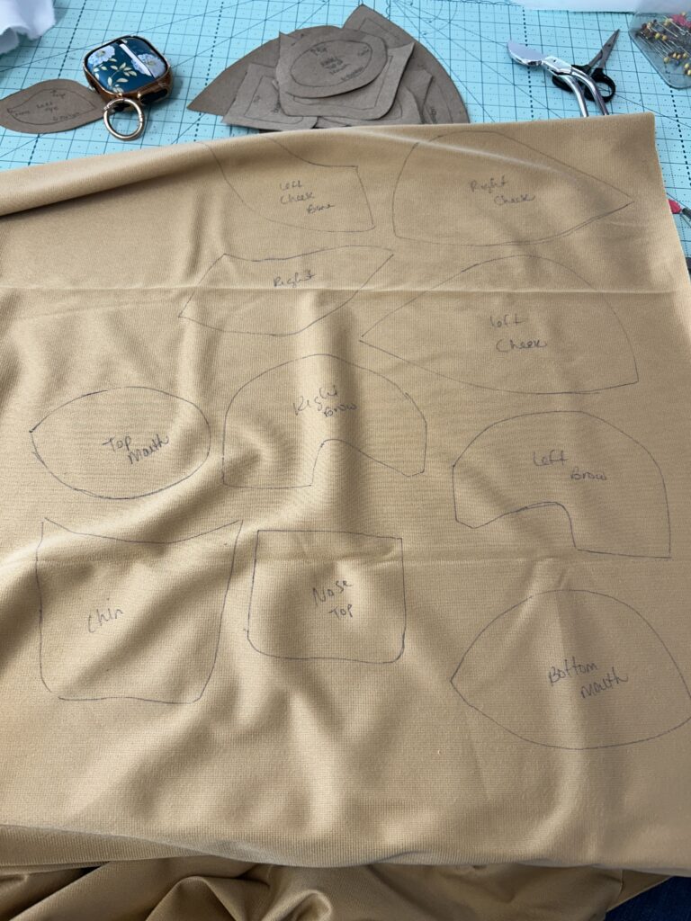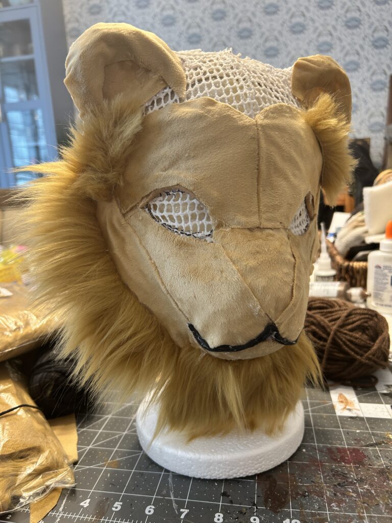 I choose a two way stretch velvet fabric to give to short haired texture of the lion face. I made up pattern pieces to attempt to blend in the seams so they were less obvious in the facial features. I used hot glue to attached the edges of the fabrics and carefully stretch it into place. I left the eye holes uncovered as they were already at a good angle for my vision.