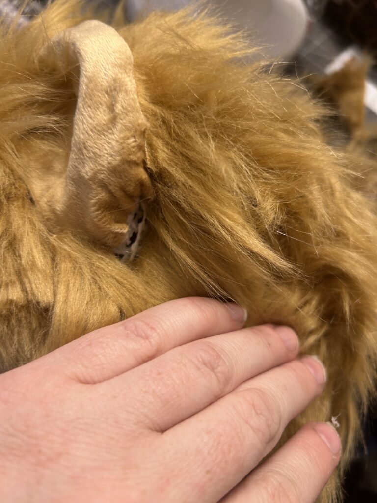 I began using the faux fur around the face to start creating the main. I cut long strips and ensured the nap was facing the correct way to make the hair fall away from the face. I then attached long pieces down the back of the head, leaving some to overlap the opening to cover up that open seam when it was worn. I finally added faux fur to the top of the head and around the ears. I went back to any small openings and added bits of fur to ensure all of the varaform was covered.
