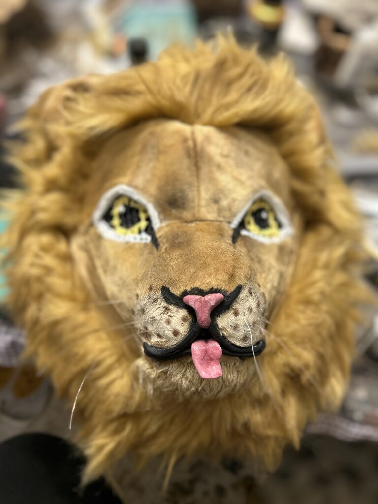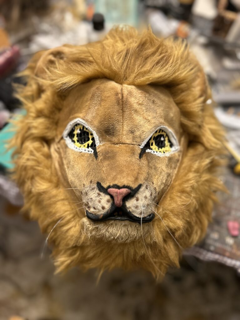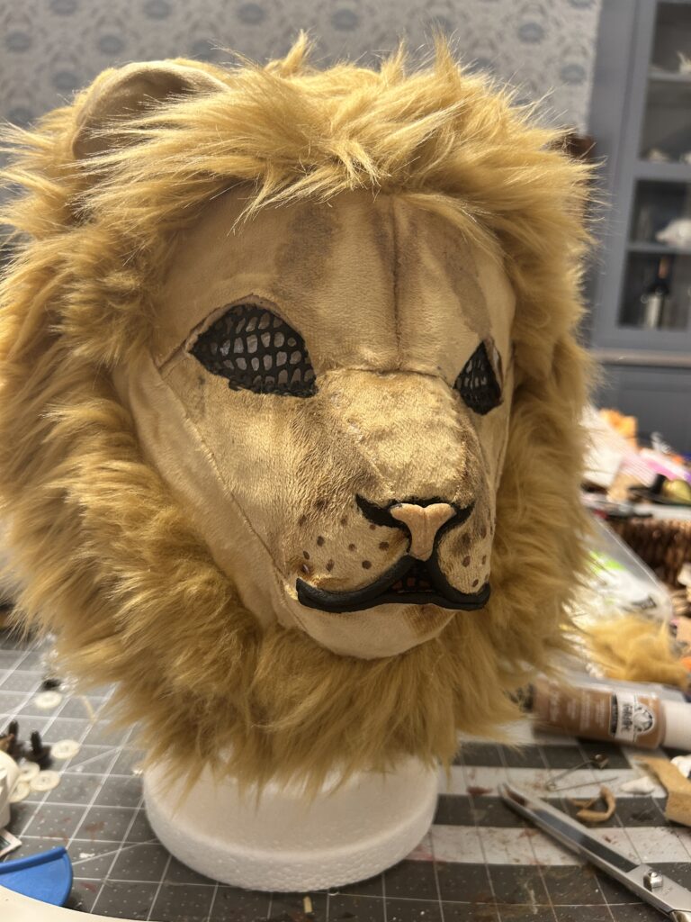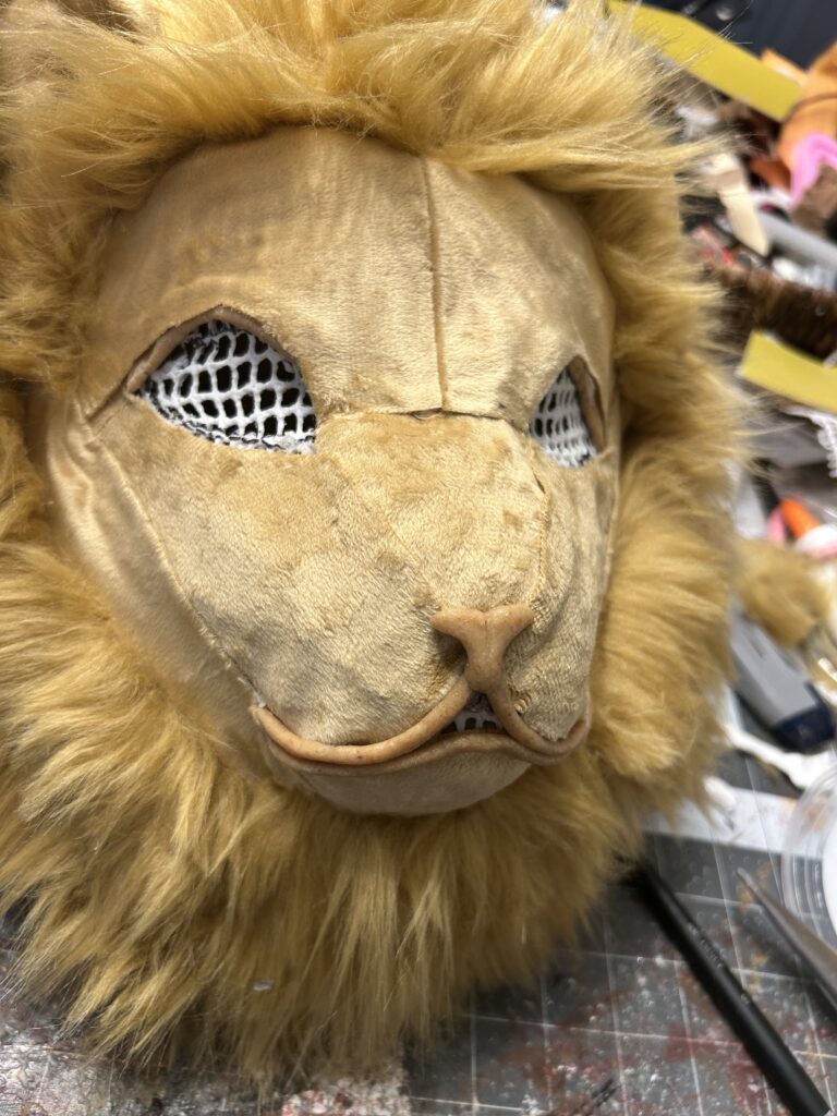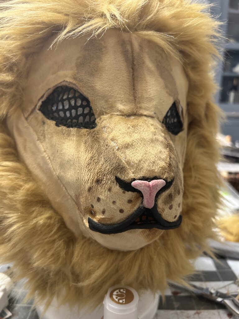 The final touch was the color of the eyes. I initially wanted to use doll eyes for the pupils. But advice from the professor led me to realize that the color and size would be lost on stage. I redirected to simply painting the varaform in the colors since I could not cover them as they were the eye holes for the actor. I then added a little tongue coming out to give the lion a nod in the friendly direction as I thought that lended to the tone of the play better.