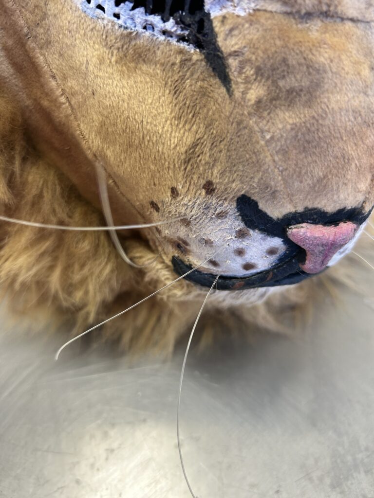 I used worbla and sculpted the nose for the lion. I also used the Worbla to create the black lips and eventually the tongue for the lion. I painted the rims of the eyes white, like in the inspiration photo. I wanted the area around the mouth and the fur directly under the mouth to be lighter so I added layers of watered down acrylic paint in several layers. I added the freckles with the back of my paint brush. Finally, I added a few whiskers by melting the end of fishing line to a piece of tin foil, pushing them through the fabric with a needle and then gluing down the back inside the mask.