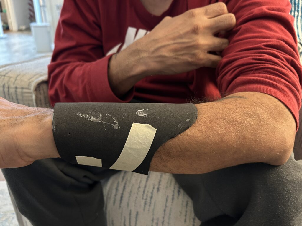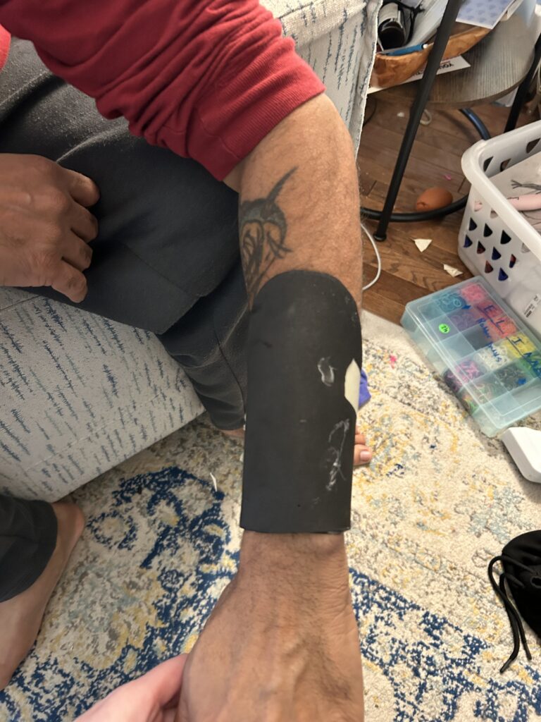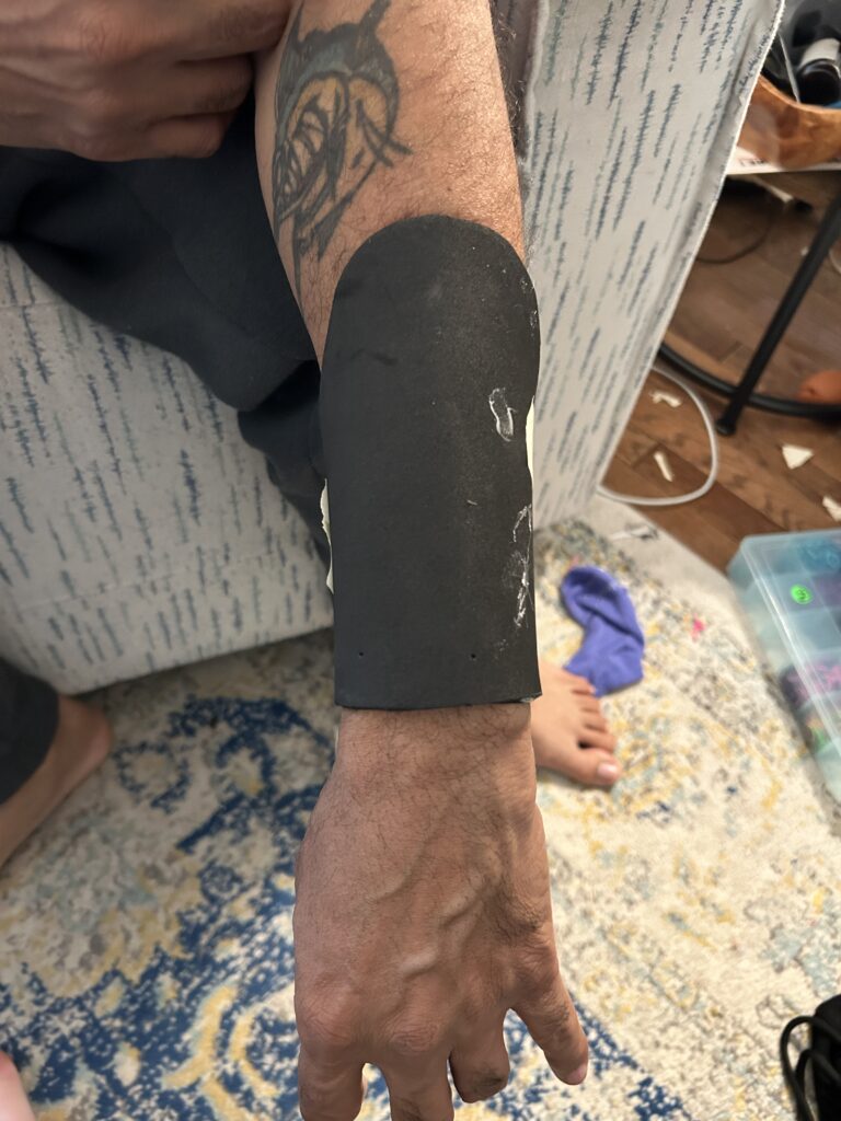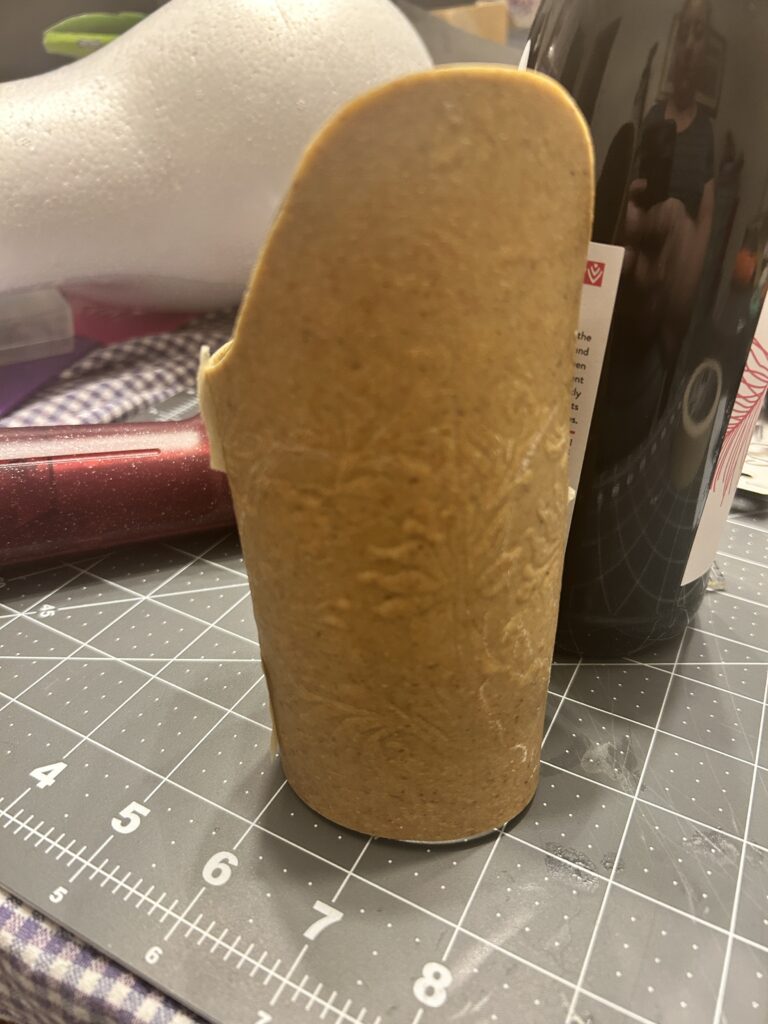 The wine bottle was also great for initializing the shaping of the bracers. I carefully heated the foam and Worbla from the back to resist getting the front too warm and losing the texture. I then pressed it around the wine bottle to start getting the curve into the form. Once it cooled enough the touch comfortably, I applied the form onto my forearm and used masking tape to hold the shape. This helped achieve the different dimensions needed for the curvature at the top of the bracer versus the bottom for the wrist.