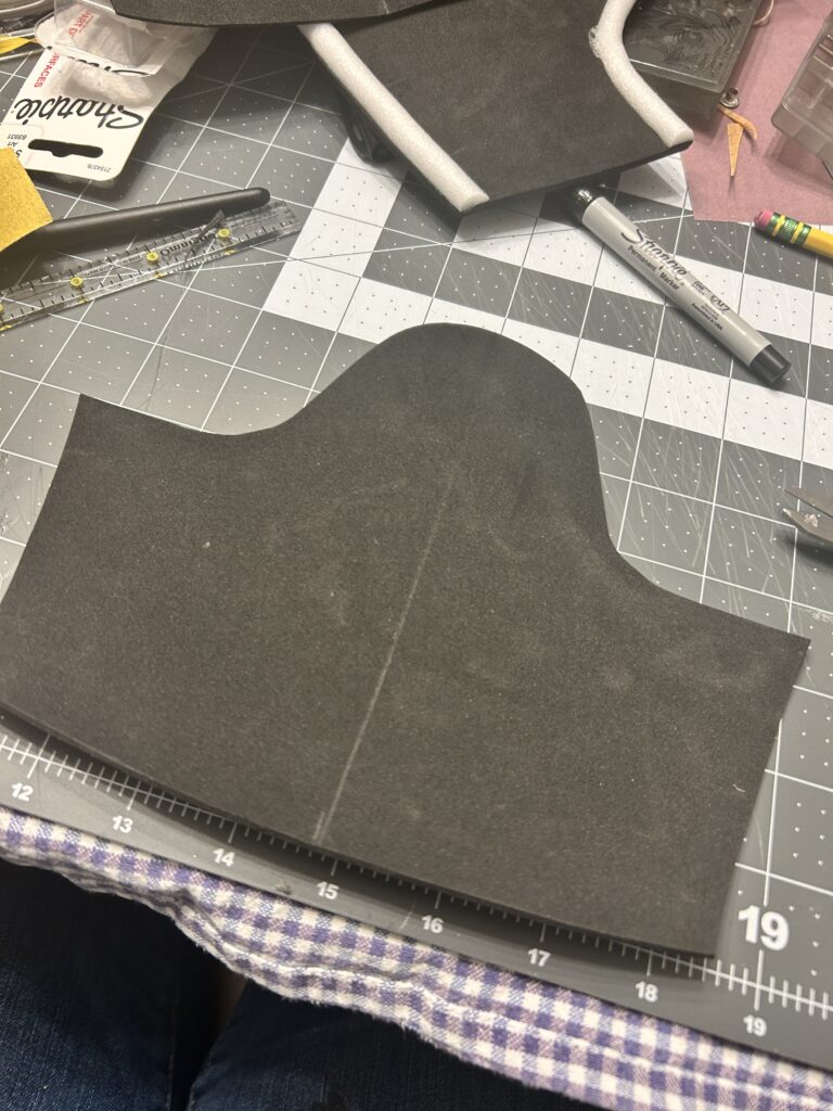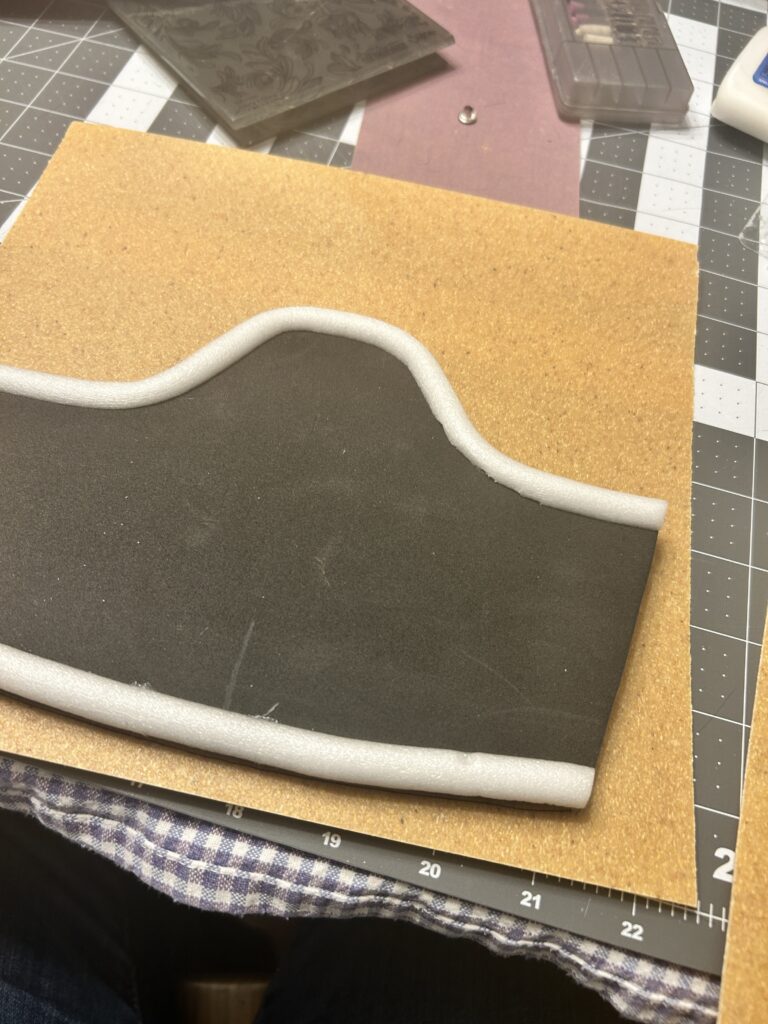 I first thought to the half round trim I wanted to use in order to have it under the Worbla. I attached foam tubing that I cut in half to form the half round. Sadly, after I had attached the foam, I realized that it would prevent me from adding on the texture I had planned. I needed the piece to still be flat in order to use the embossing folder I had for the Worbla. I was able to remove the half round craft foam and still utilize the piece of EVA foam I had cut for the bracer.