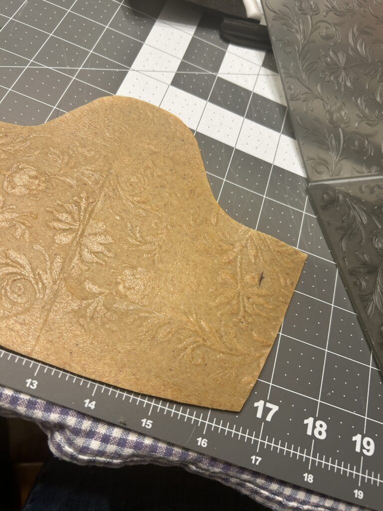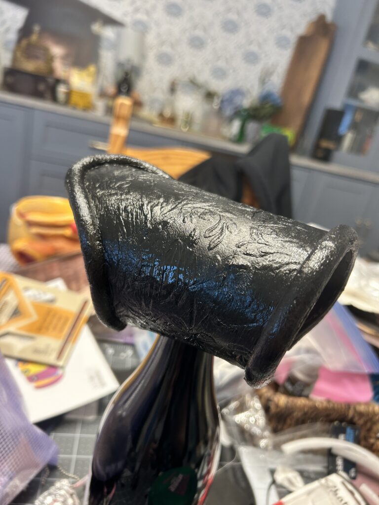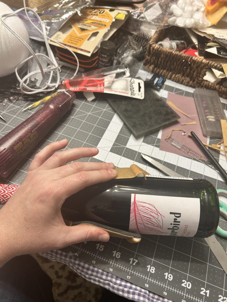 Once I adhered the Worbla, I warmed it up and let it cool slightly. I took the embossing folder and pressed hard against the Worbla as it laid flat on the table. This was not giving me a great impression so I took a nearby wine bottle and used it as a rolling pin to apply better pressure.