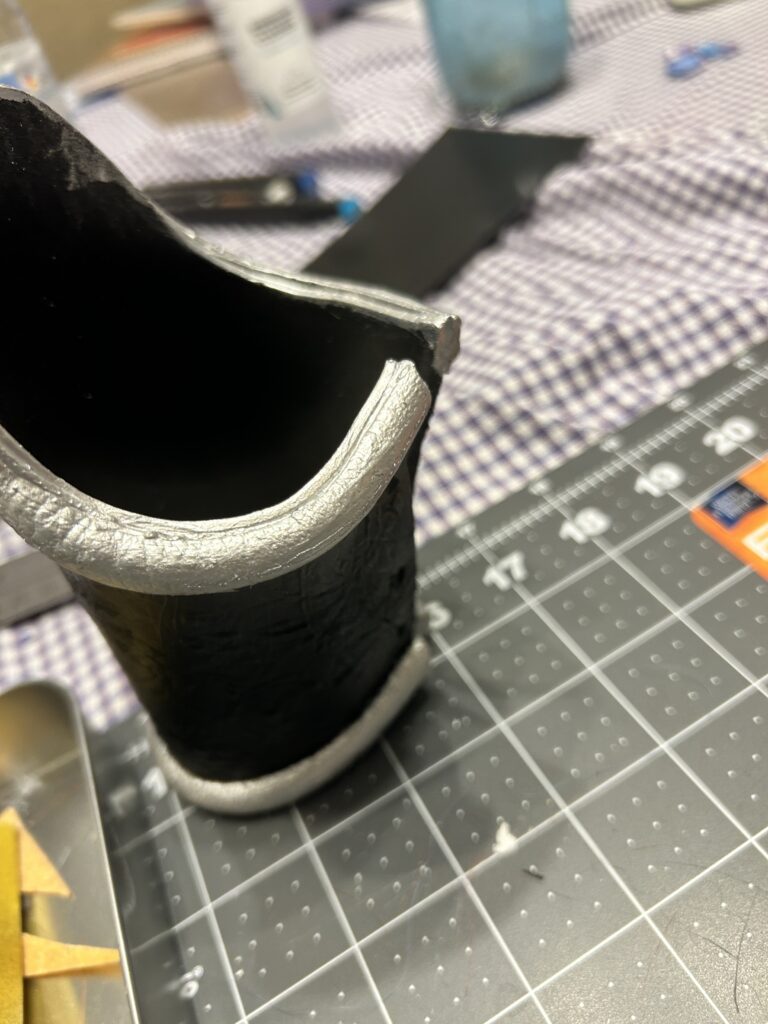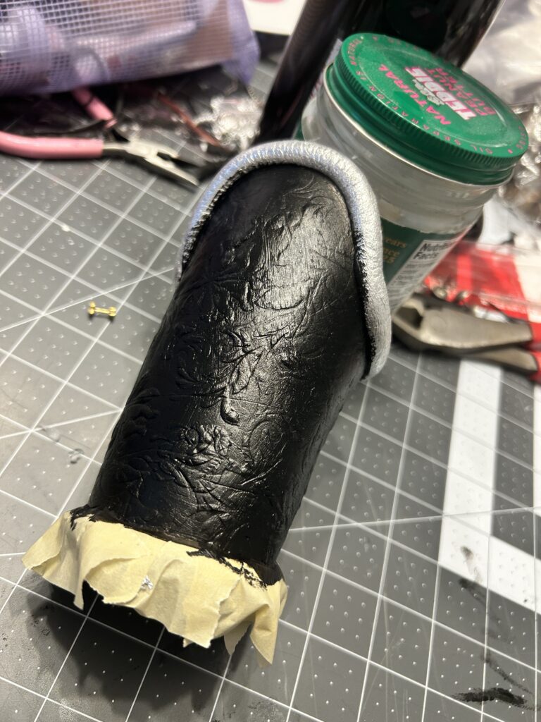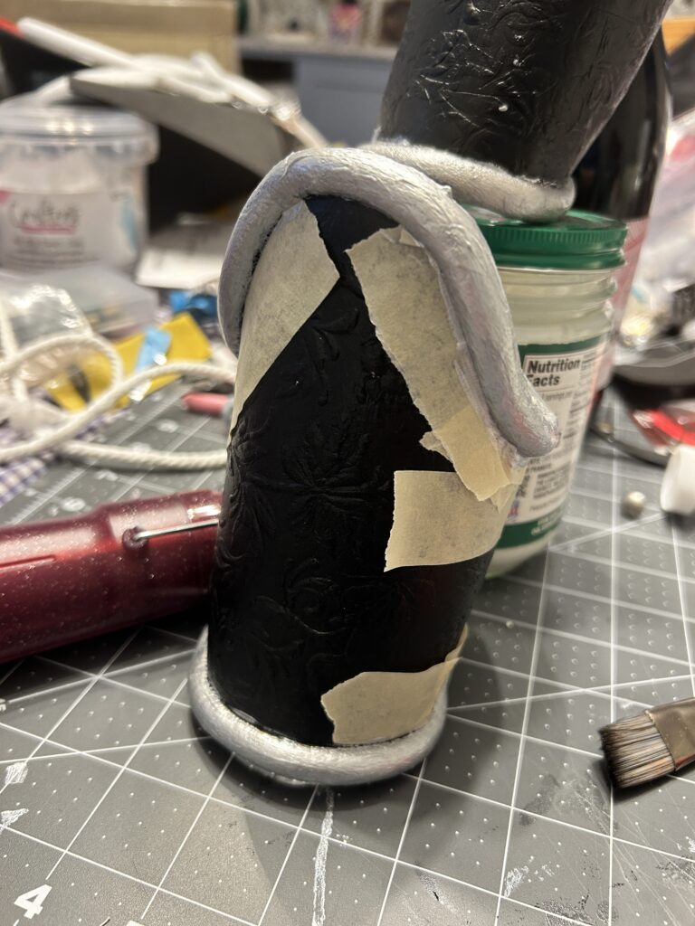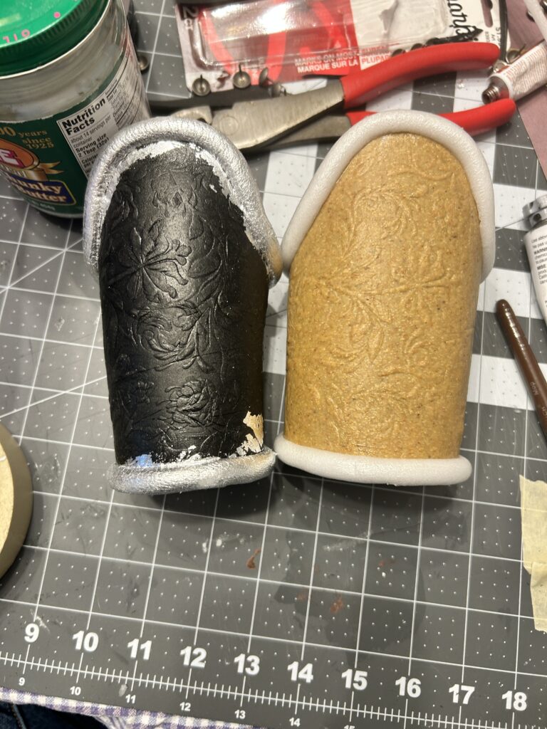 So I had to reverse course. I painted the entire bracer in Golden Bone Black acrylic paint. I was fine with this since I knew that the silver paint would have more depth with the black underneath. I was then able to more successfully tape off the main body and give the half round craft foam several coats of silver acrylic paint.