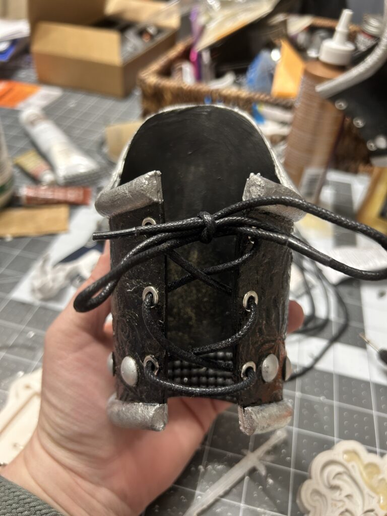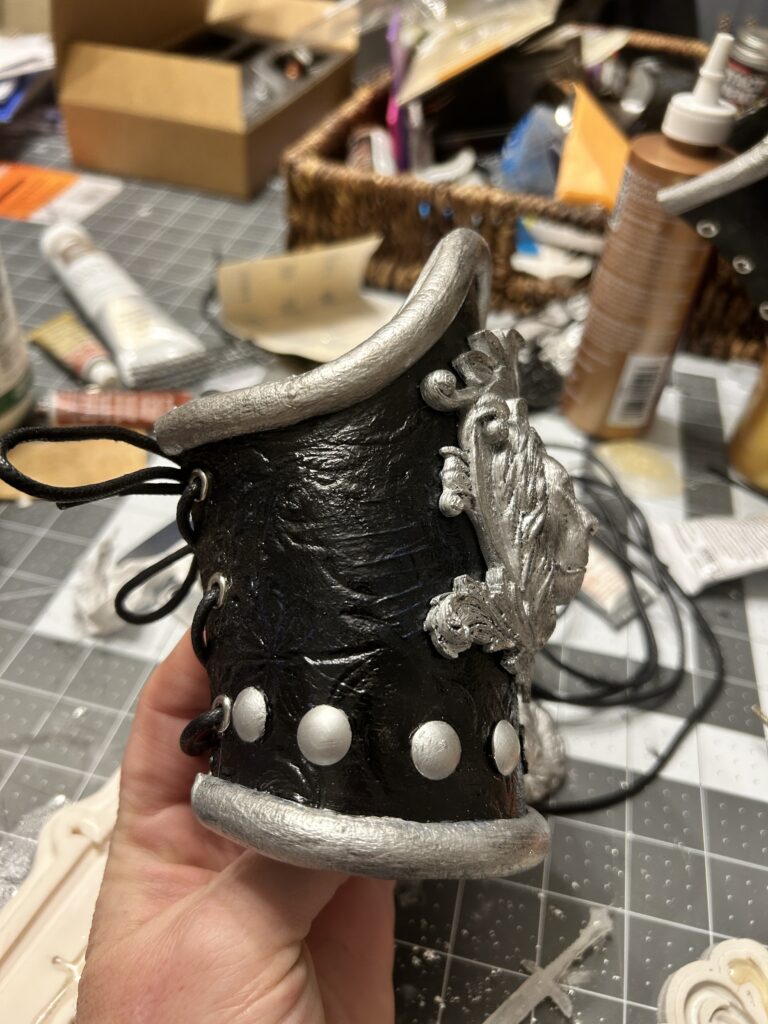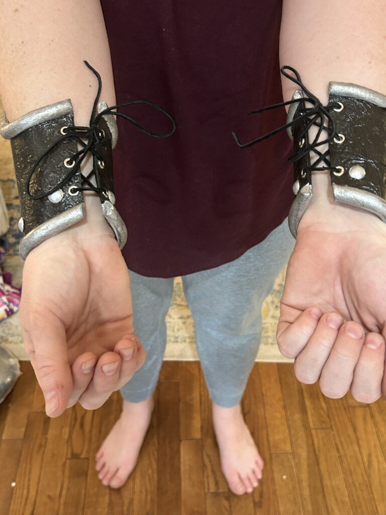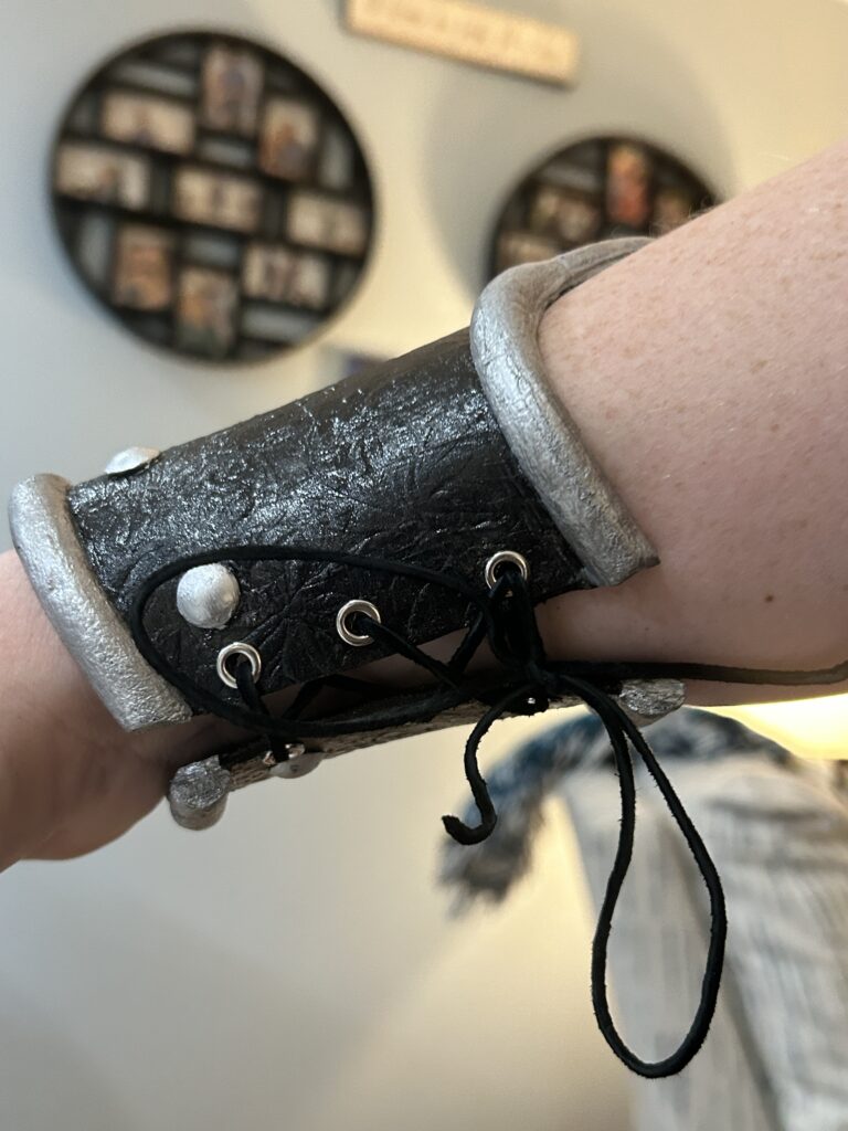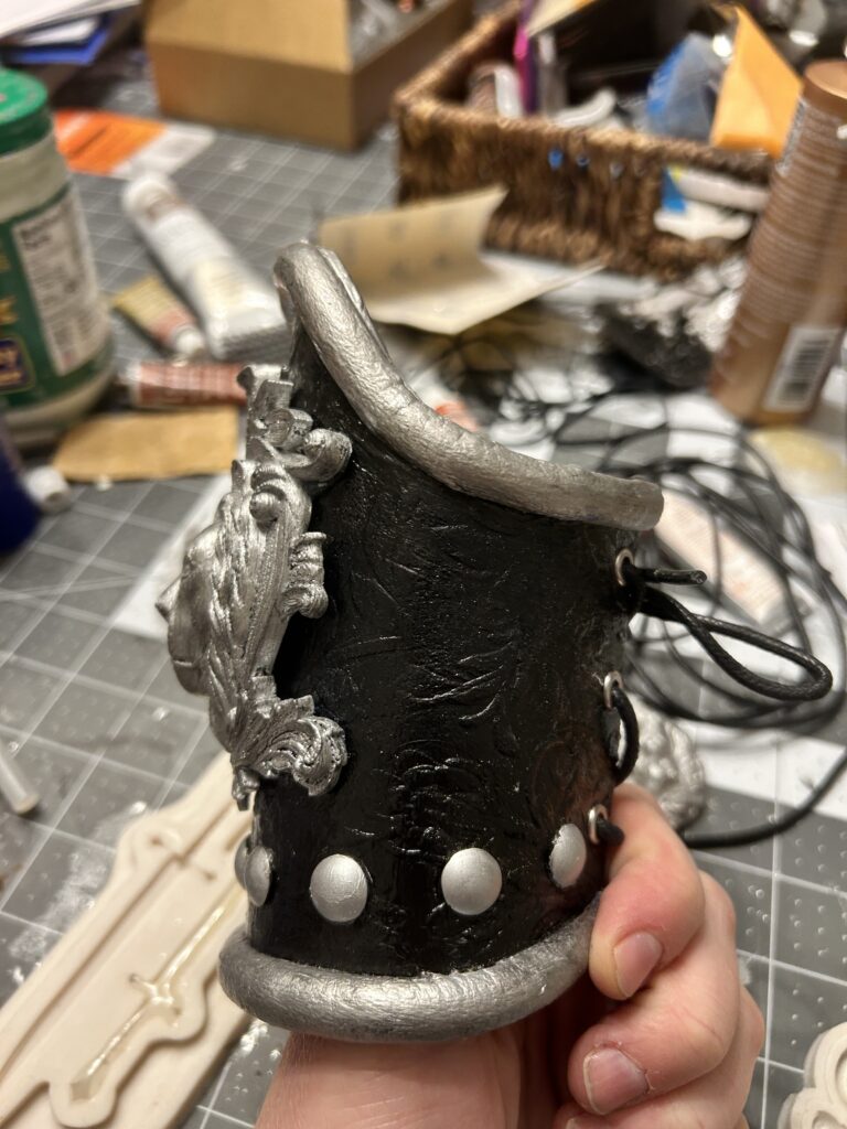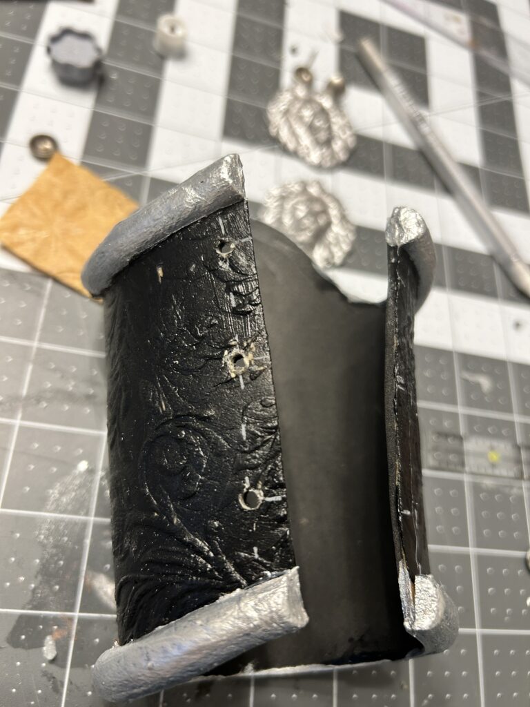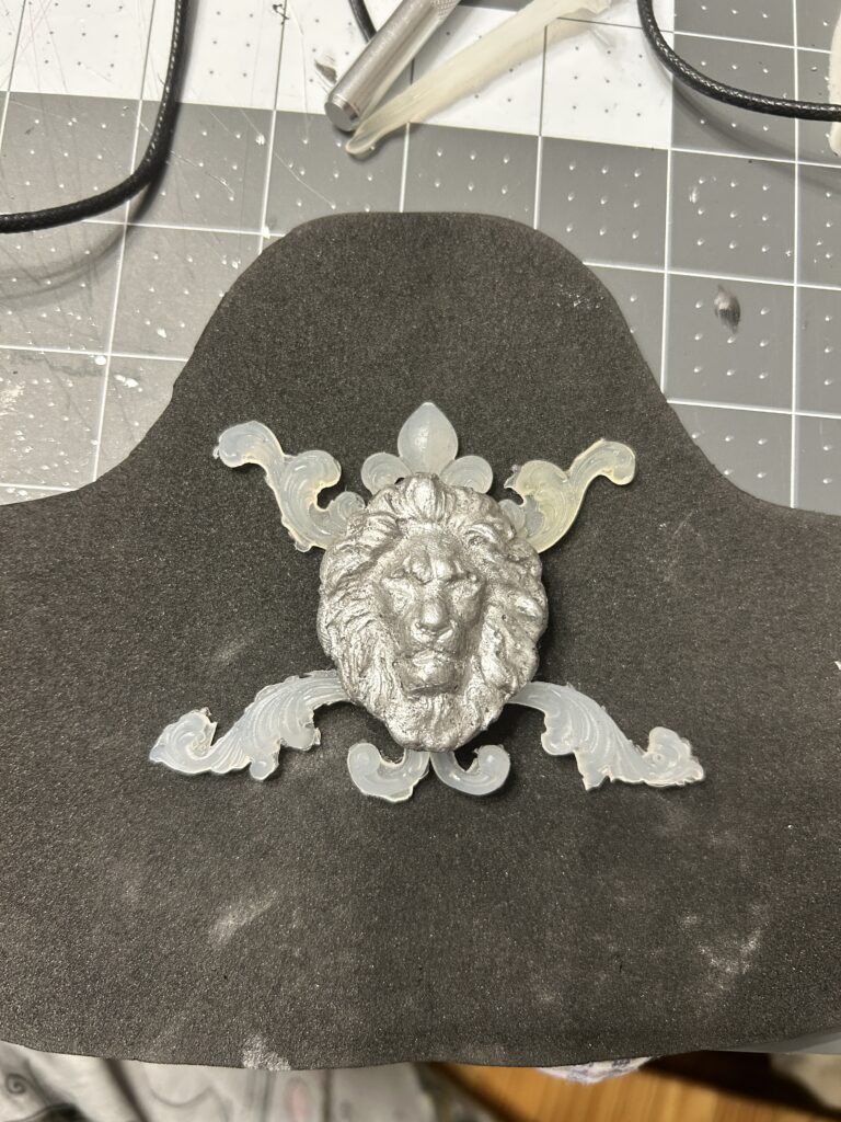 Luckily, the 3D print came in plenty of time to add to the project. I first had to heat up the print to get it to take the curve of the bracers. I applied adhesive glue and silver leaf to each lion. I then added the silver paint that I used for the half round trim to each to add more dimension. Finally, I used Rub N’Buff in Pewter to add shadows to the half round foam, the medallions, and the grommets at the bottom, ensuring that all the silver pieces had a cohesive finish. I then hot glued the medallion in place.
