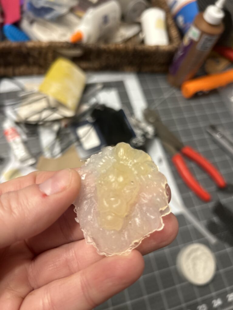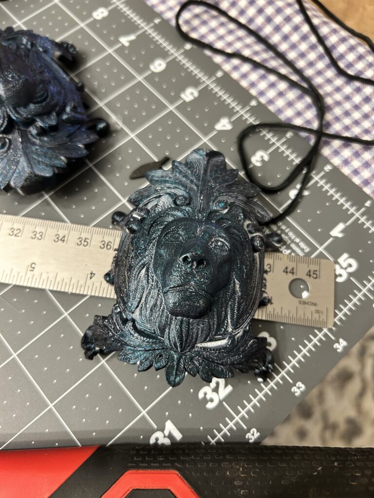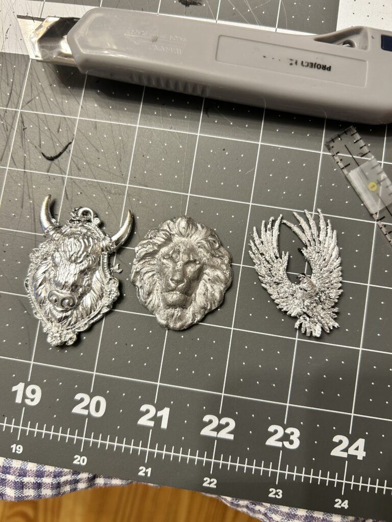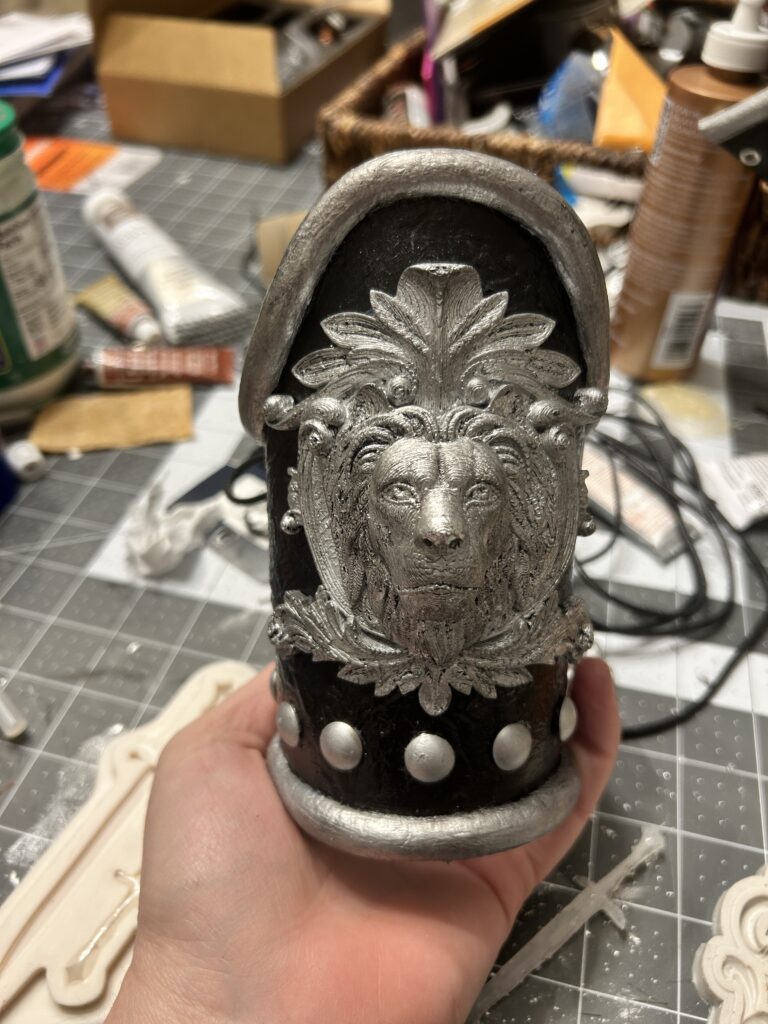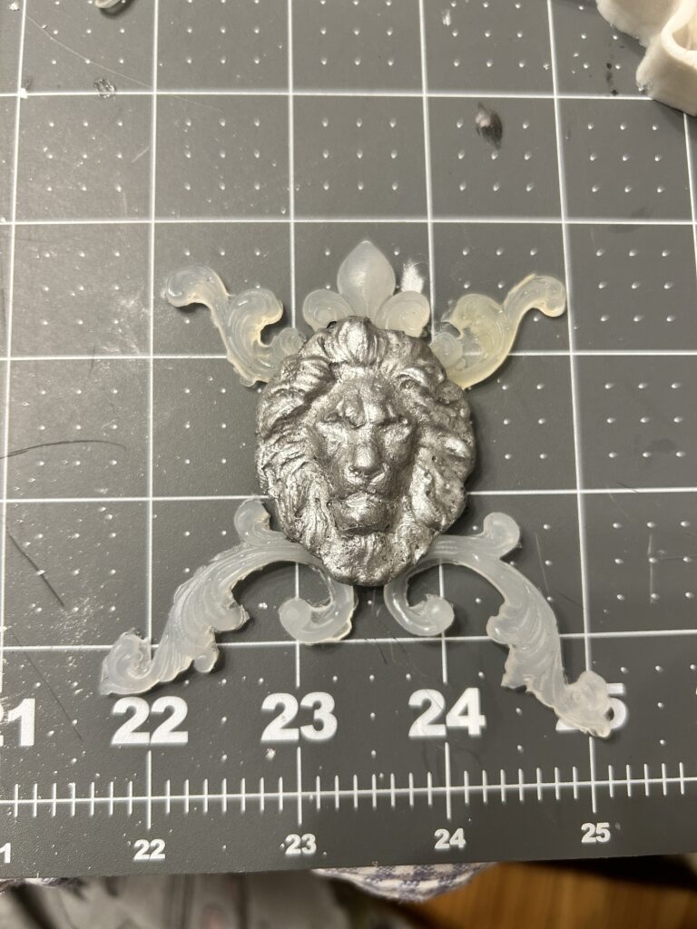 I found three smaller options that I felt would be a good base for the middle medallion. I applied silver leaf to each of the options to see how the details would show up on top of the bracers. I decided that the lion head worked best and utilized other silicone molds to add other details in order to increase the size since the lion head alone was much too small.