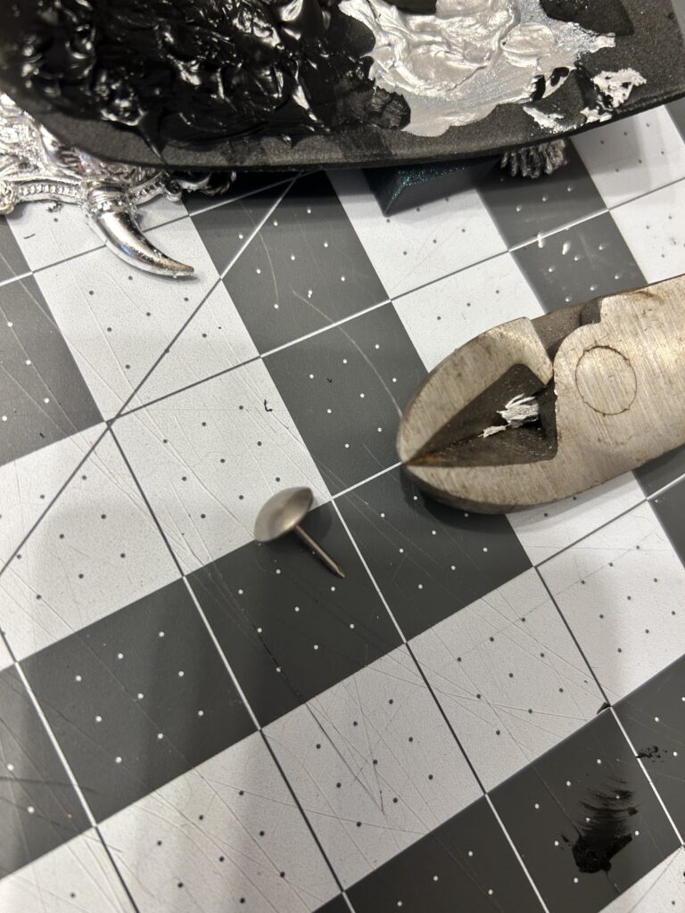 For the bottom metal round pieces near the wrist, I used quilters thumbtacks the the backs cut off to make them lay flat. I had several options for the middle piece. The sketch was a bit blurry to see the actually depiction. But looking at the other pieces in the sketch, it seemed accurate to use either a ram’s head, an eagle, or a lion since that is a relevant symbol of Roman emperors. I wandered the craft aisles looking for inspiration. I knew that the size of the medallion would be my biggest problem. I found nothing immediately that had the correct proportions. I thought through my available resources and reached out to my local library. They have a maker space and a 3D printer free for use. The only catch was they could not guarantee a quick print as there were other people in line ahead of me to use the machine. I decided to take the risk and put my print request in. In the meantime, I worked on a back up option in case the 3D print idea failed.