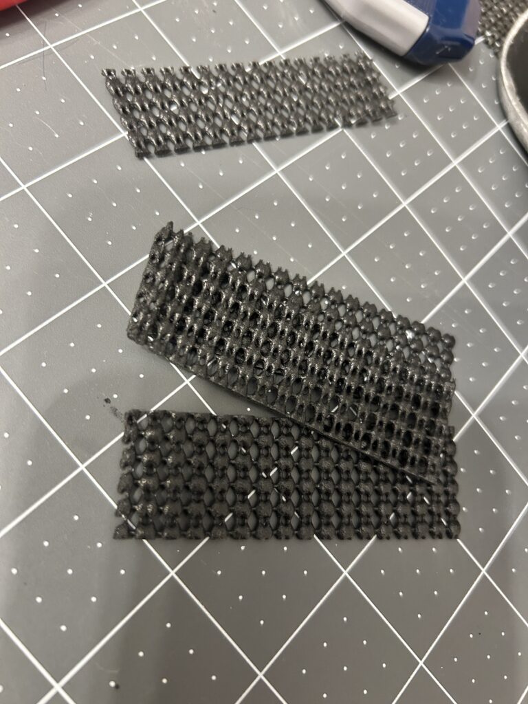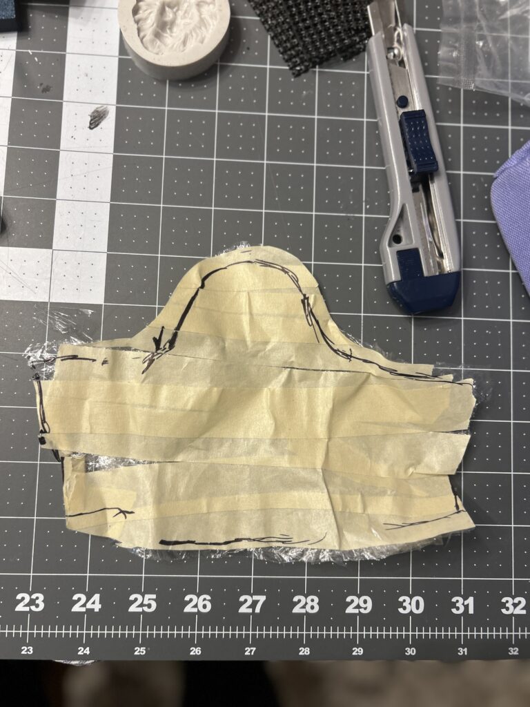 Once I had the shape I cut off the tape pattern and refined it onto brown paper. I cut my first form out of 2mm EVA foam. I tried that on the model, using masking tape to hold it together to check measurements on the arm.