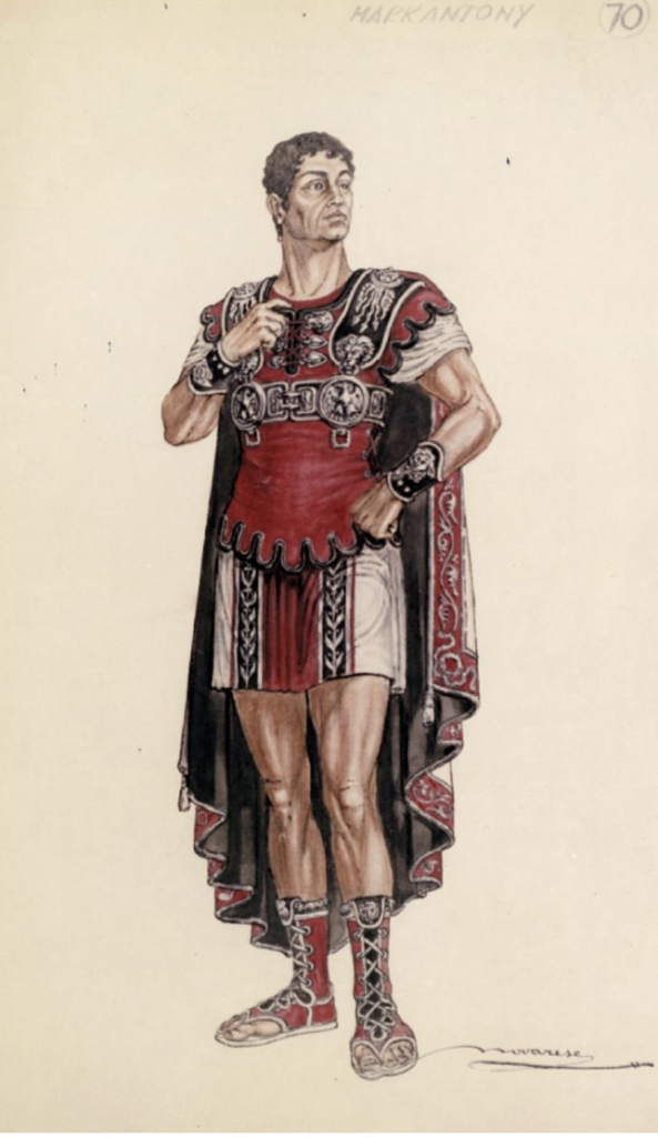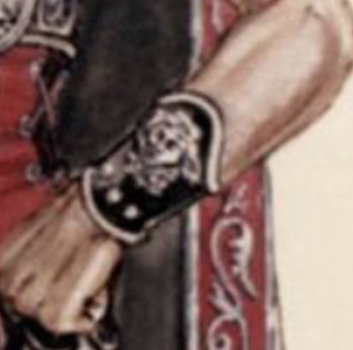 I was challenged to make a matching pair of arm bracers based on the above sketch of Marc Antony. The professor wished for the design to aesthetically match as close to possible. My construction idea was to have EVA foam provide the base and cover the foam with a layer of Worbla. The adornments would be added after the Worbla was set. The backs of the arm bracers would lace up. This would give room for the actor to have comfort and have the ties be easily replaced in case of an incident in the run of the show.